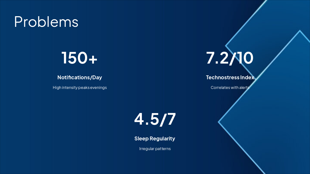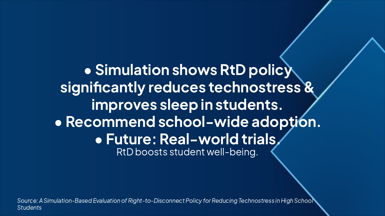 { "headers": [ "Phase", "Key Activities", "Outputs" ], "rows": [ [ "1. Agent Initialization", "Agent-based simulation of 1000 high school students with initial profiles (e.g., schedules, stress baselines)", "Simulated student population ready for interactions" ], [ "2. Dynamic Modeling", "Model incoming notifications, student responses, and stress accumulation mechanisms", "Daily behavioral and stress dynamics tracked" ], [ "3. RtD Policy Enforcement", "Implement Right-to-Disconnect: No notifications or alerts after 8PM", "Policy-constrained notification flows" ], [ "4. Evaluation", "Run 30-day simulation and compute metrics: Technostress index, sleep score", "Quantitative results on technostress reduction and sleep improvement" ] ] }