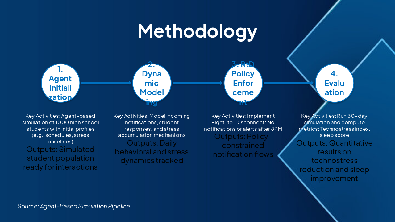 The Methodology workflow simulates 1000 high school students through four phases: agent initialization with profiles, dynamic modeling of notifications and stress, and RtD policy enforcement banning alerts after 8PM. It concludes with a 30-day evaluation yielding metrics on technostress reduction and sleep improvement.
