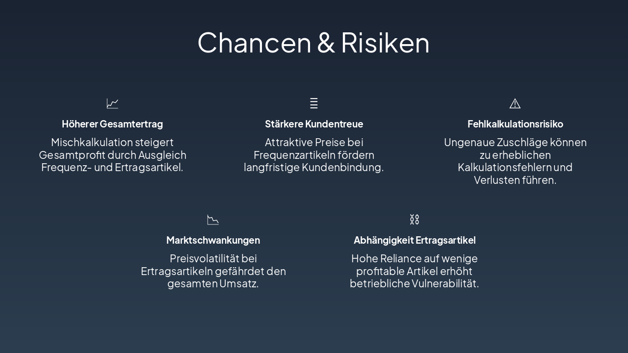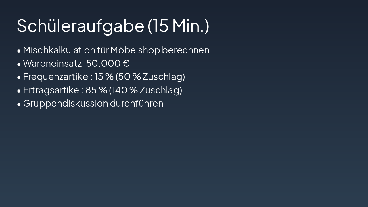 Beispiel für Mischkalkulation: Wareneinsatz 100.000 €. Frequenzartikel (10%): +60% Zuschlag. Ertragsartikel (90%): +160% Zuschlag. Gesamt VK: 250.000 €.