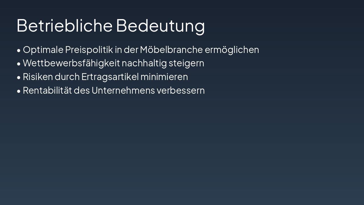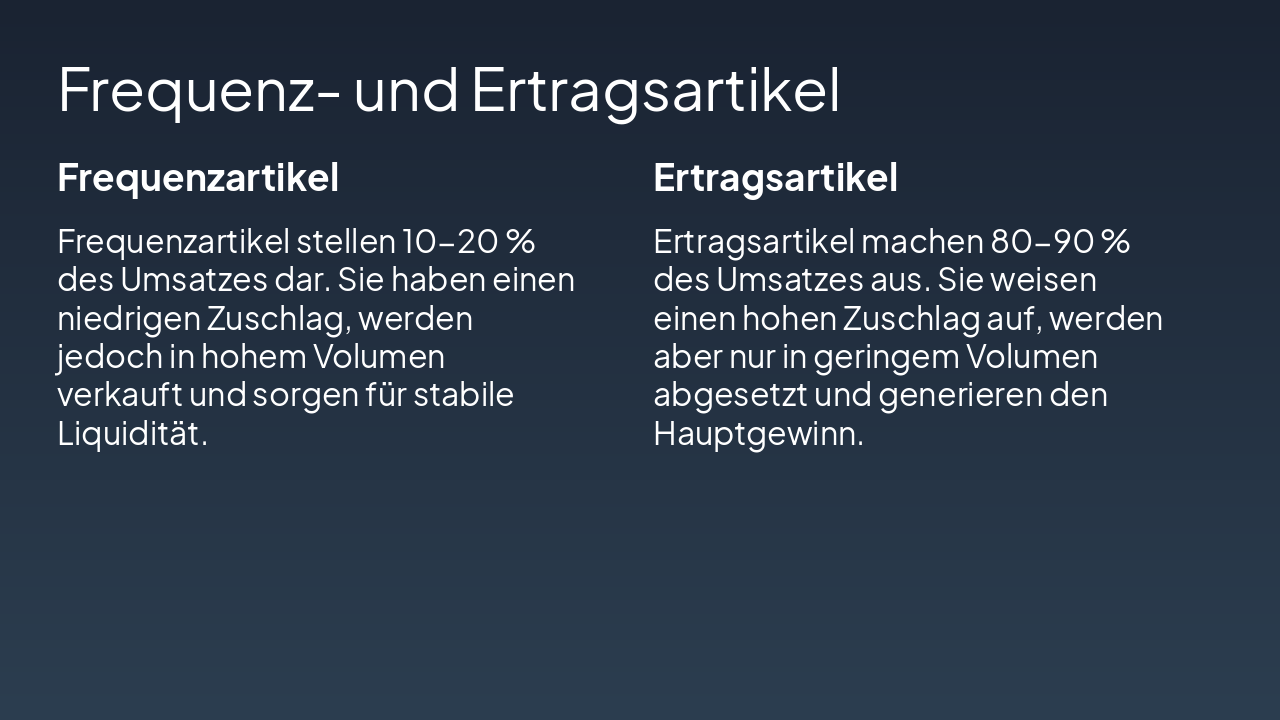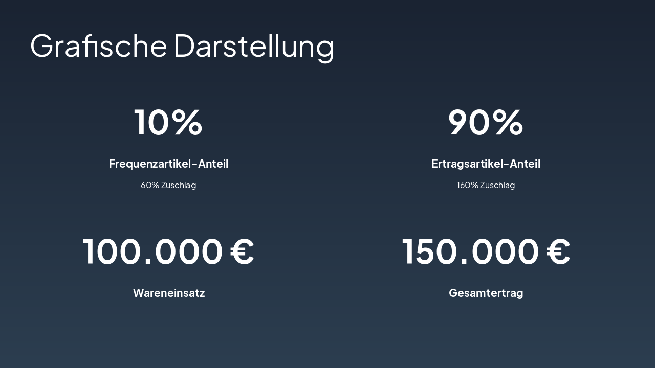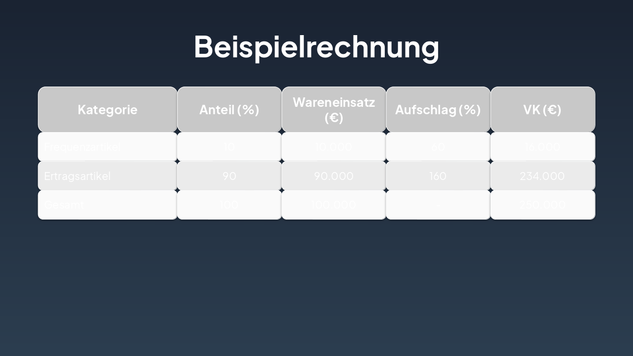 { "headers": [ "Kategorie", "Anteil (%)", "Wareneinsatz (€)", "Aufschlag (%)", "VK (€)" ], "rows": [ [ "Frequenzartikel", "10", "10.000", "60", "16.000" ], [ "Ertragsartikel", "90", "90.000", "160", "234.000" ], [ "Gesamt", "100", "100.000", "-", "250.000" ] ] }