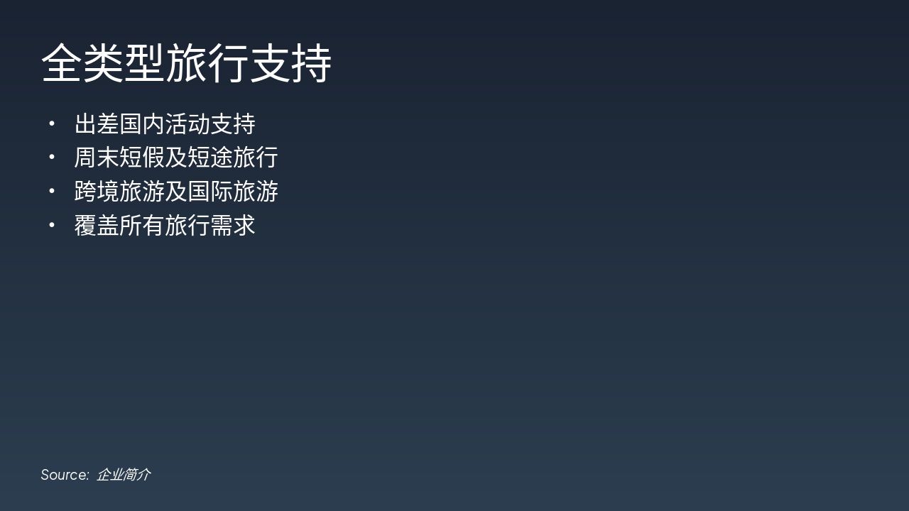 本幻灯片介绍全类型旅行支持,涵盖出差国内活动、周末短假及短途旅行、跨境旅游及国际旅游。整体覆盖所有旅行需求,提供全面支持。