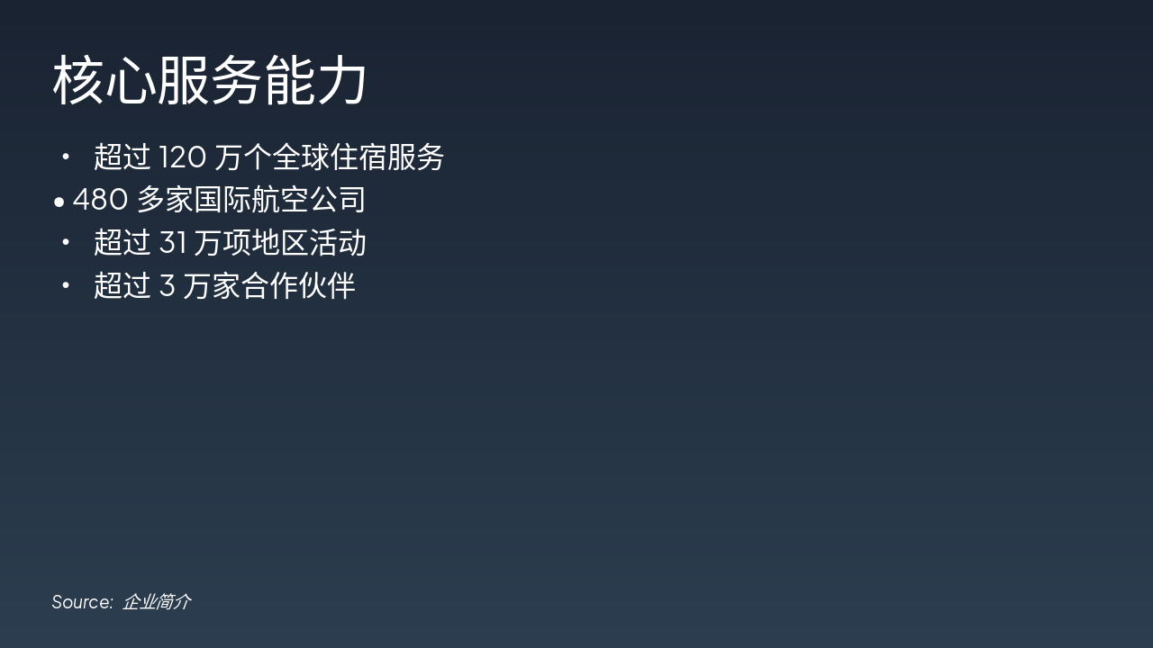 核心服务能力涵盖超过120万个全球住宿服务和480多家国际航空公司。平台还提供超过31万项地区活动,并与超过3万家合作伙伴合作。