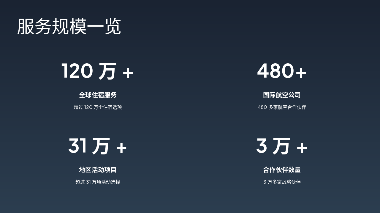 本滑展示服务规模一览:全球住宿超过120万个选项、480多家国际航空合作伙伴、31万+地区活动项目,以及3万+战略伙伴。 这些数据突显平台的广泛覆盖和服务能力。