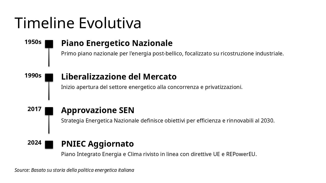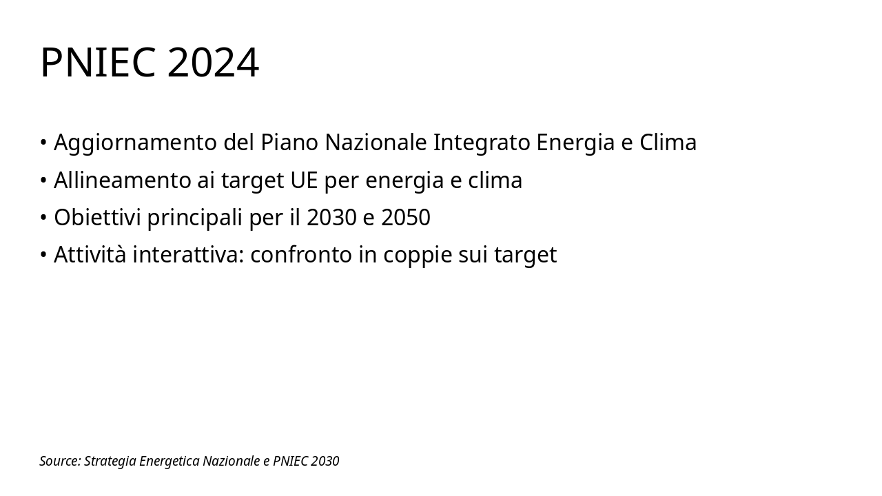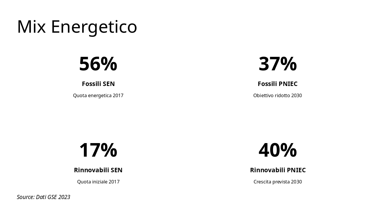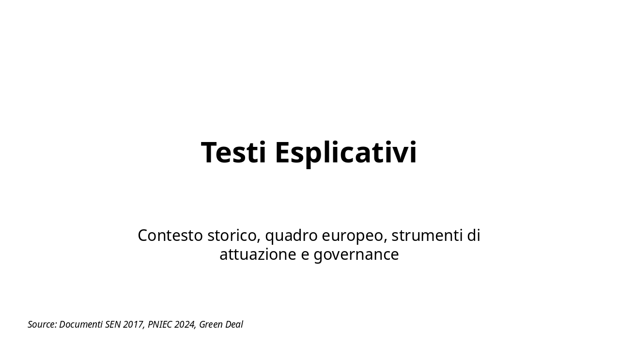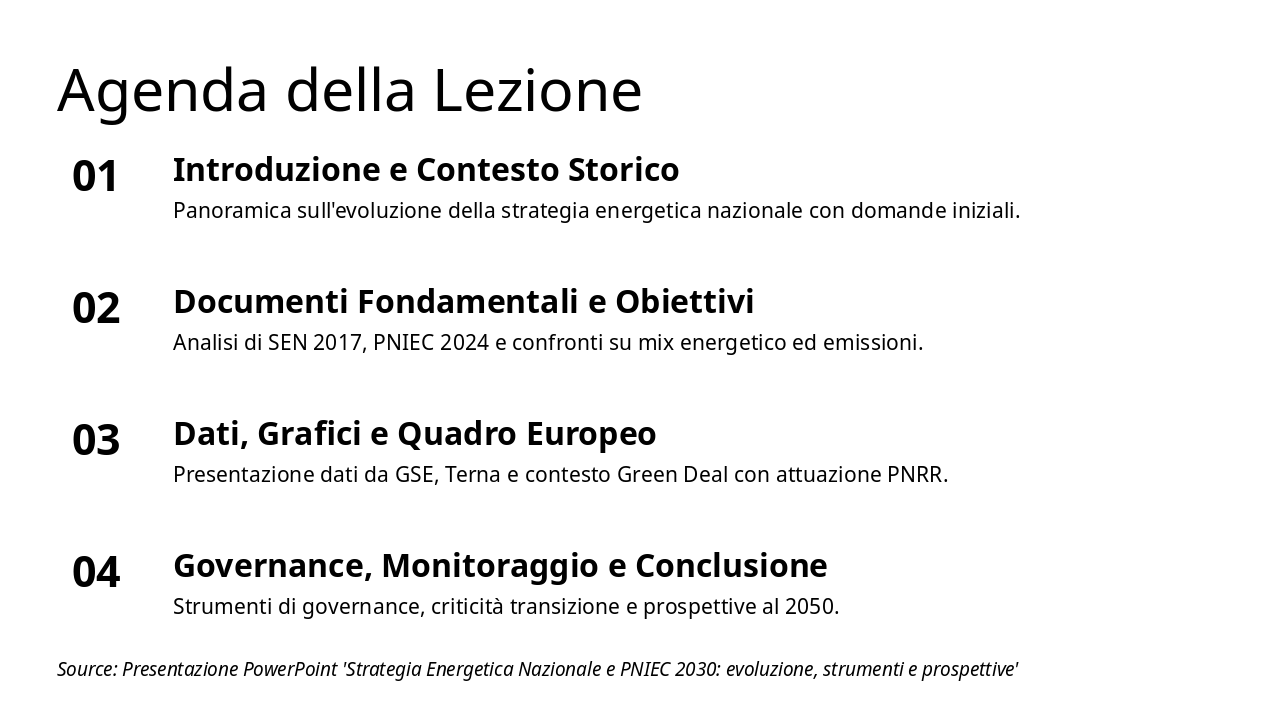 Introduci l'analisi dei documenti chiave per la strategia energetica italiana, preparando il terreno per confronti e grafici successivi. Durata stimata: 20-25 minuti. Includi pausa per domande.