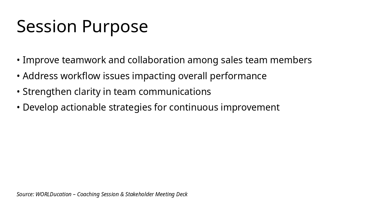 The slide features a title slide for a coaching session focused on enhancing collaboration and team performance. It includes a subtitle specifying the Worlducation Sales Team as the target group.