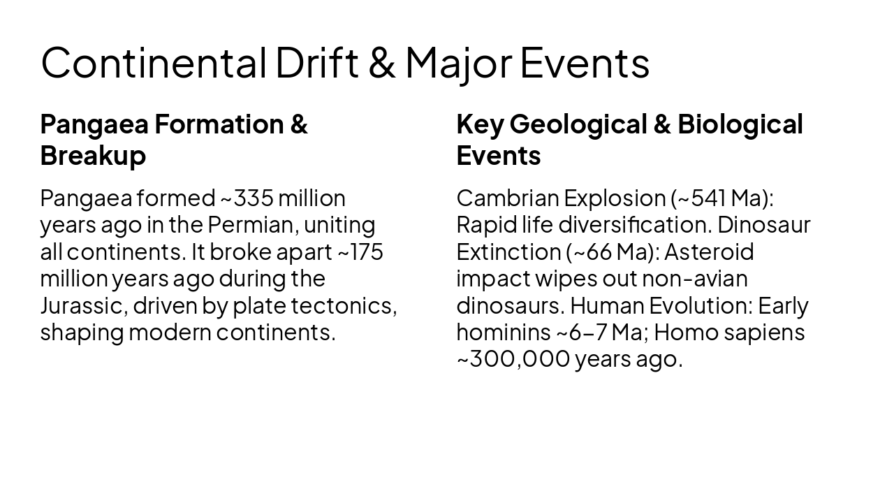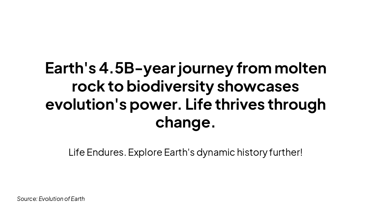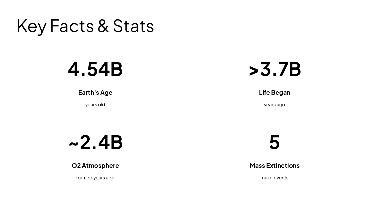 Key geological, biological milestones, timeline, stats, conclusion. Source: Evolution of Earth: stages of Earth's formation, Hadean, Archean, Proterozoic, and Phanerozoic eons, origin of life, continental drift, and major geological and biological events