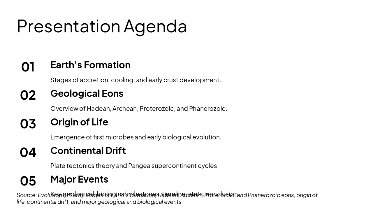 This agenda slide outlines a presentation on Earth's history, starting with its formation through accretion, cooling, and early crust development. It then covers geological eons, the origin of life, continental drift via plate tectonics, and major geological/biological events with timelines and conclusions.