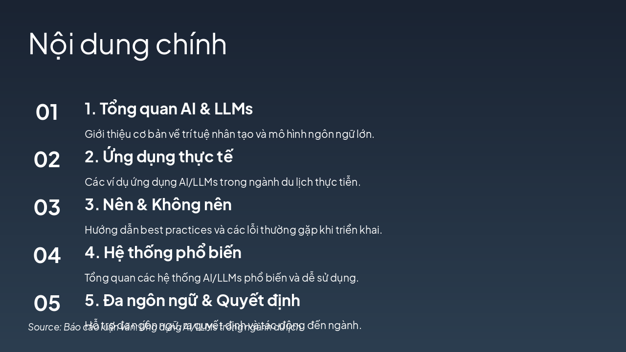 Slide này trình bày nội dung chính của buổi hội thảo với 5 phần: Tổng quan AI & LLMs, Ứng dụng thực tế trong du lịch, Nên & Không nên khi triển khai, Hệ thống phổ biến, và Đa ngôn ngữ & Quyết định. Mỗi phần kèm mô tả ngắn gọn về giới thiệu cơ bản, ví dụ thực tiễn, best practices, hệ thống dễ dùng và tác động ngành.