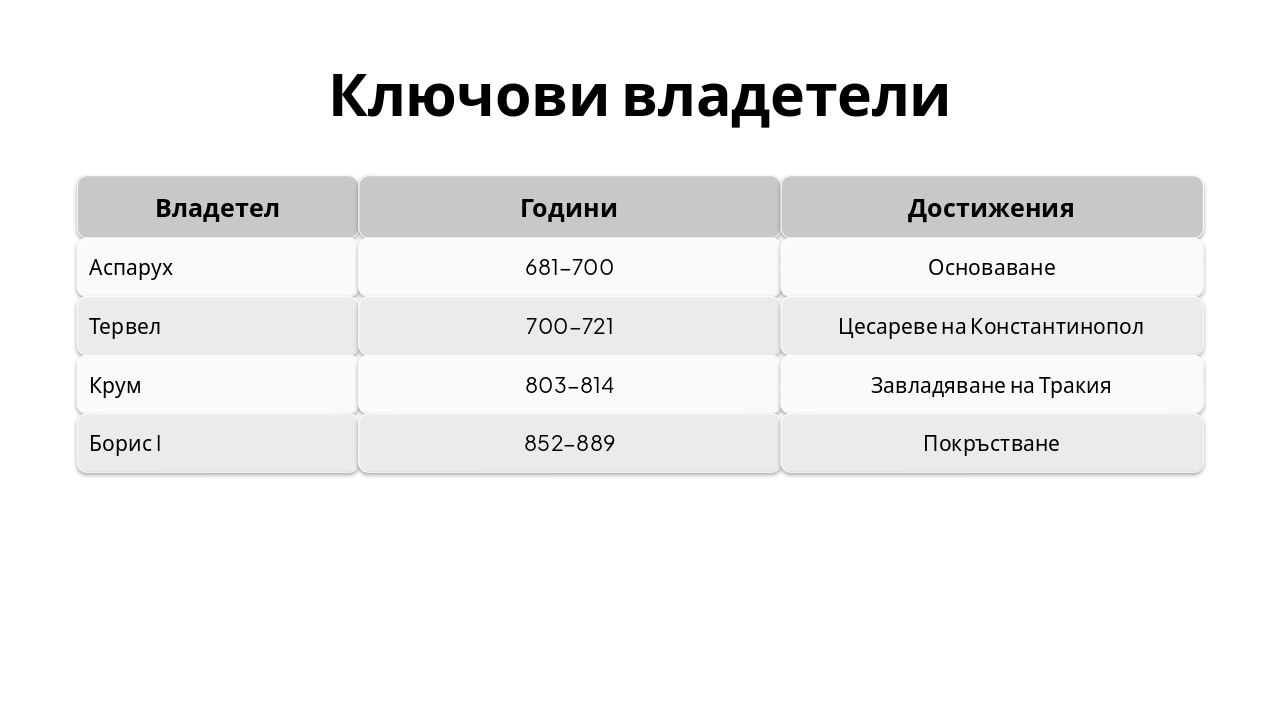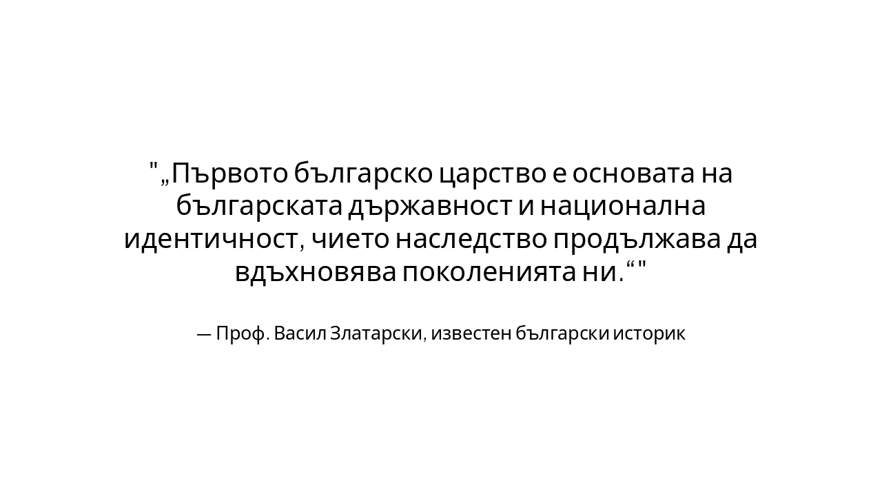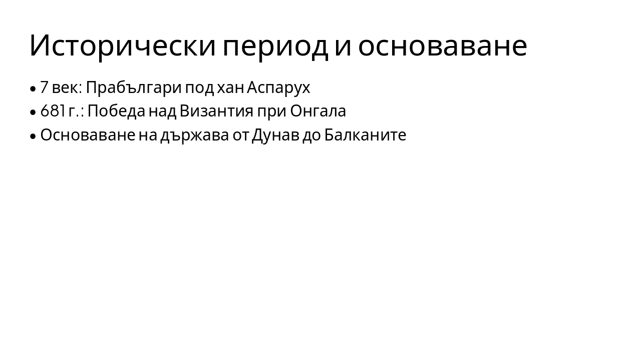 This title slide is titled "The First Bulgarian Empire." It covers the empire's foundation, expansion, rulers, culture, and heritage from 681 to 1018 AD.