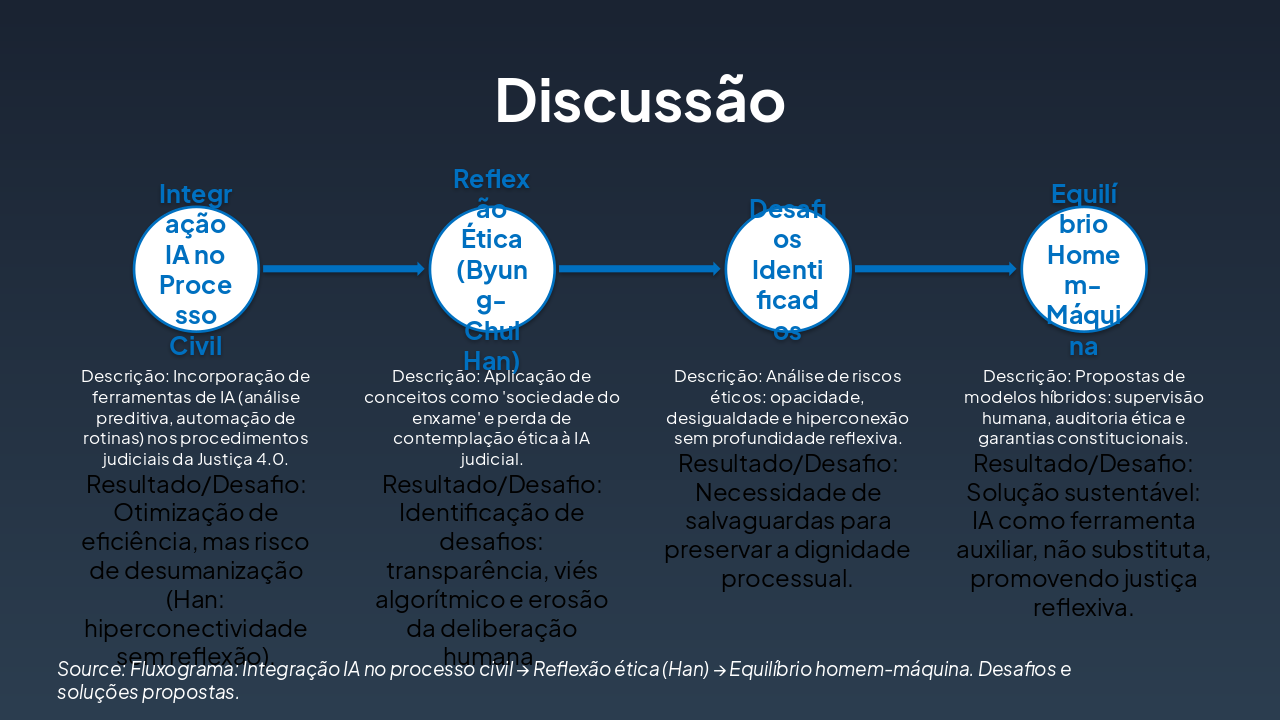 Source: Fluxograma: Integração IA no processo civil → Reflexão ética (Han) → Equilíbrio homem-máquina. Desafios e soluções propostas.