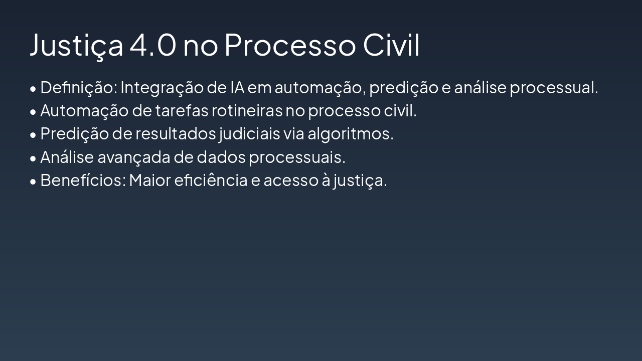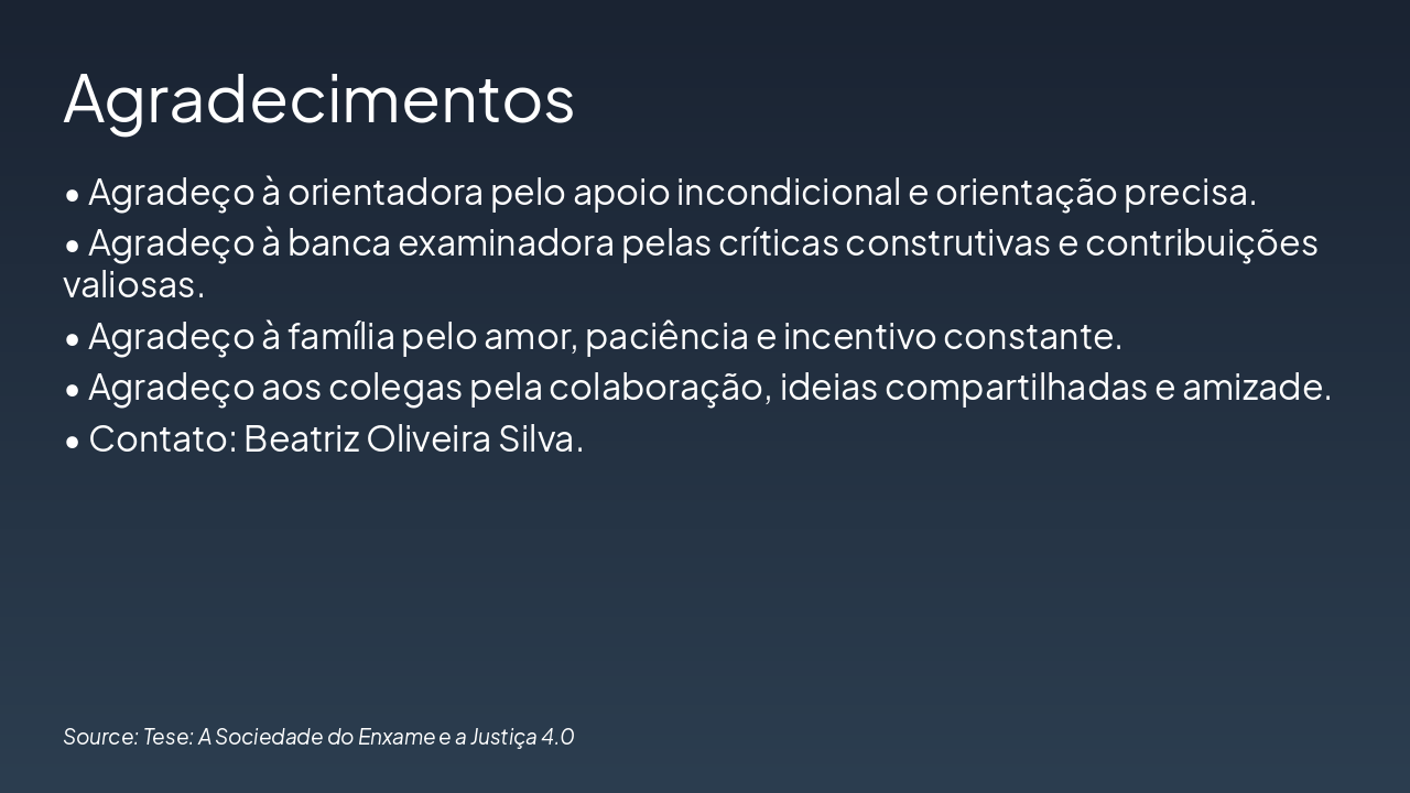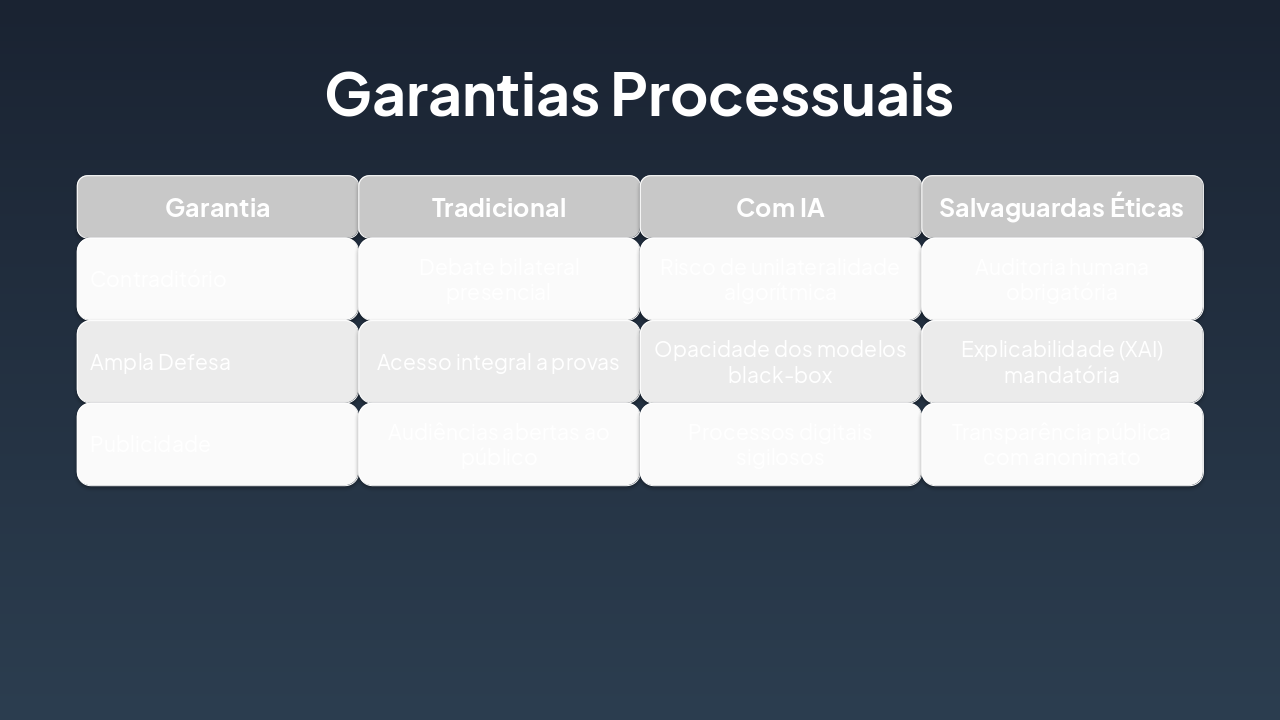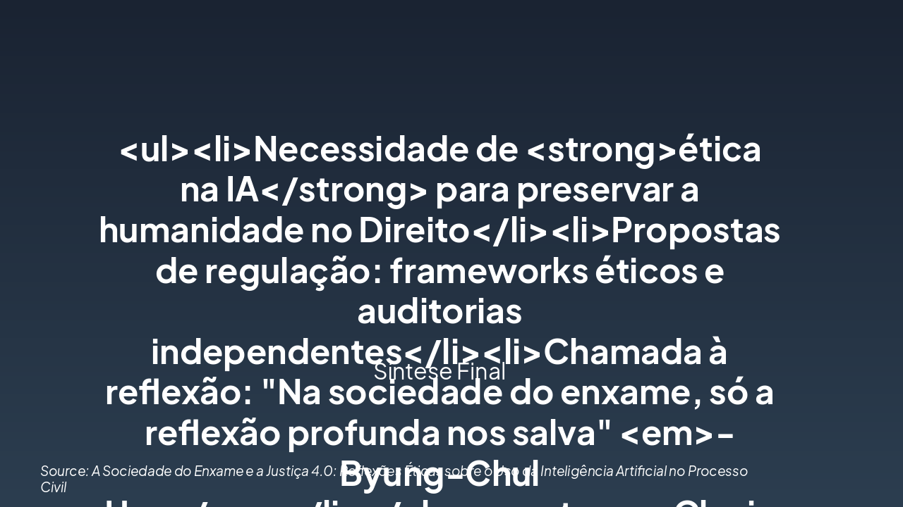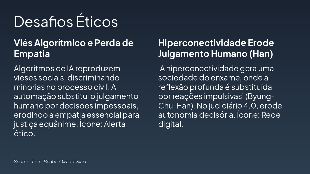{ "headers": [ "Etapa", "Descrição", "Resultado/Desafio" ], "rows": [ [ "Integração IA no Processo Civil", "Incorporação de ferramentas de IA (análise preditiva, automação de rotinas) nos procedimentos judiciais da Justiça 4.0.", "Otimização de eficiência, mas risco de desumanização (Han: hiperconectividade sem reflexão)." ], [ "Reflexão Ética (Byung-Chul Han)", "Aplicação de conceitos como 'sociedade do enxame' e perda de contemplação ética à IA judicial.", "Identificação de desafios: transparência, viés algorítmico e erosão da deliberação humana." ], [ "Desafios Identificados", "Análise de riscos éticos: opacidade, desigualdade e hiperconexão sem profundidade reflexiva.", "Necessidade de salvaguardas para preservar a dignidade processual." ], [ "Equilíbrio Homem-Máquina", "Propostas de modelos híbridos: supervisão humana, auditoria ética e garantias constitucionais.", "Solução sustentável: IA como ferramenta auxiliar, não substituta, promovendo justiça reflexiva." ] ] }