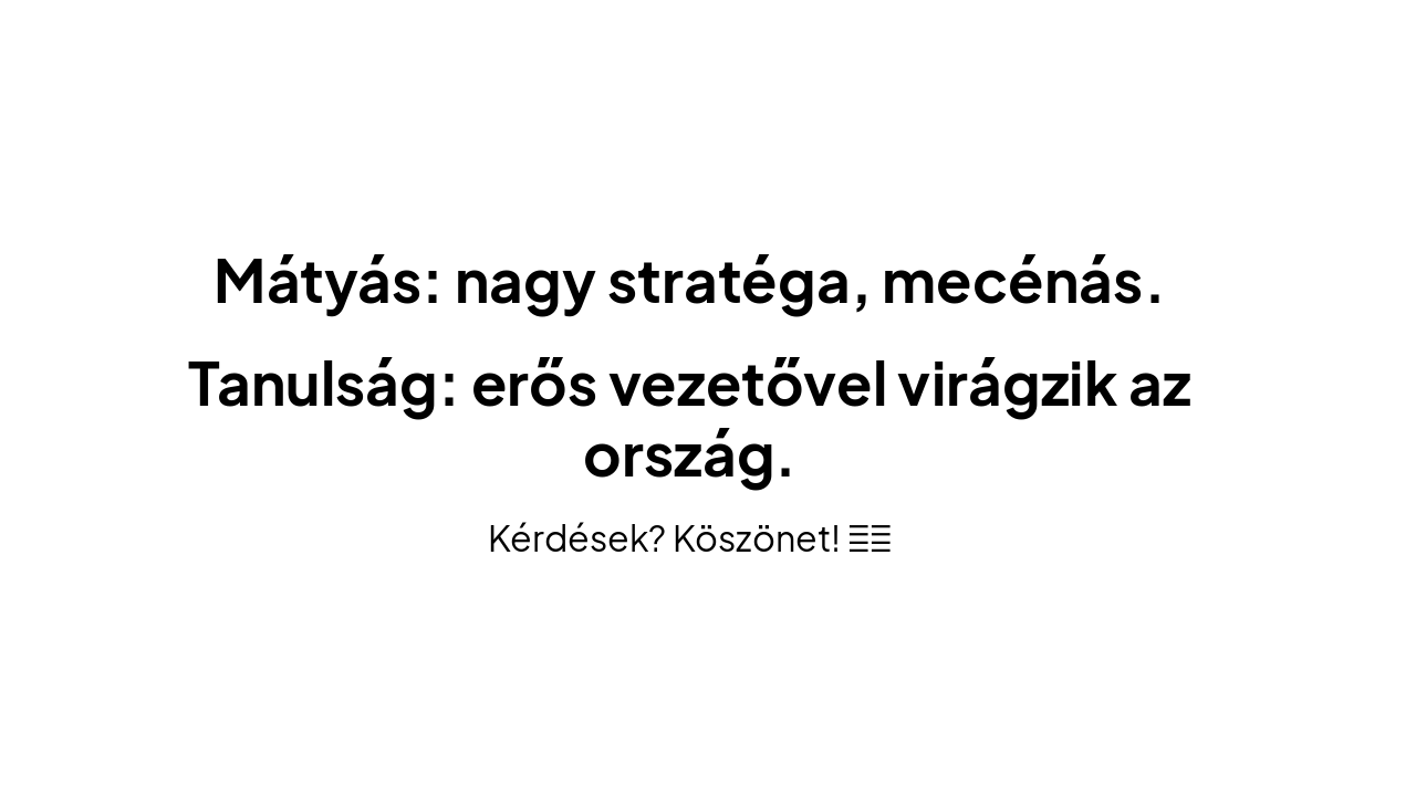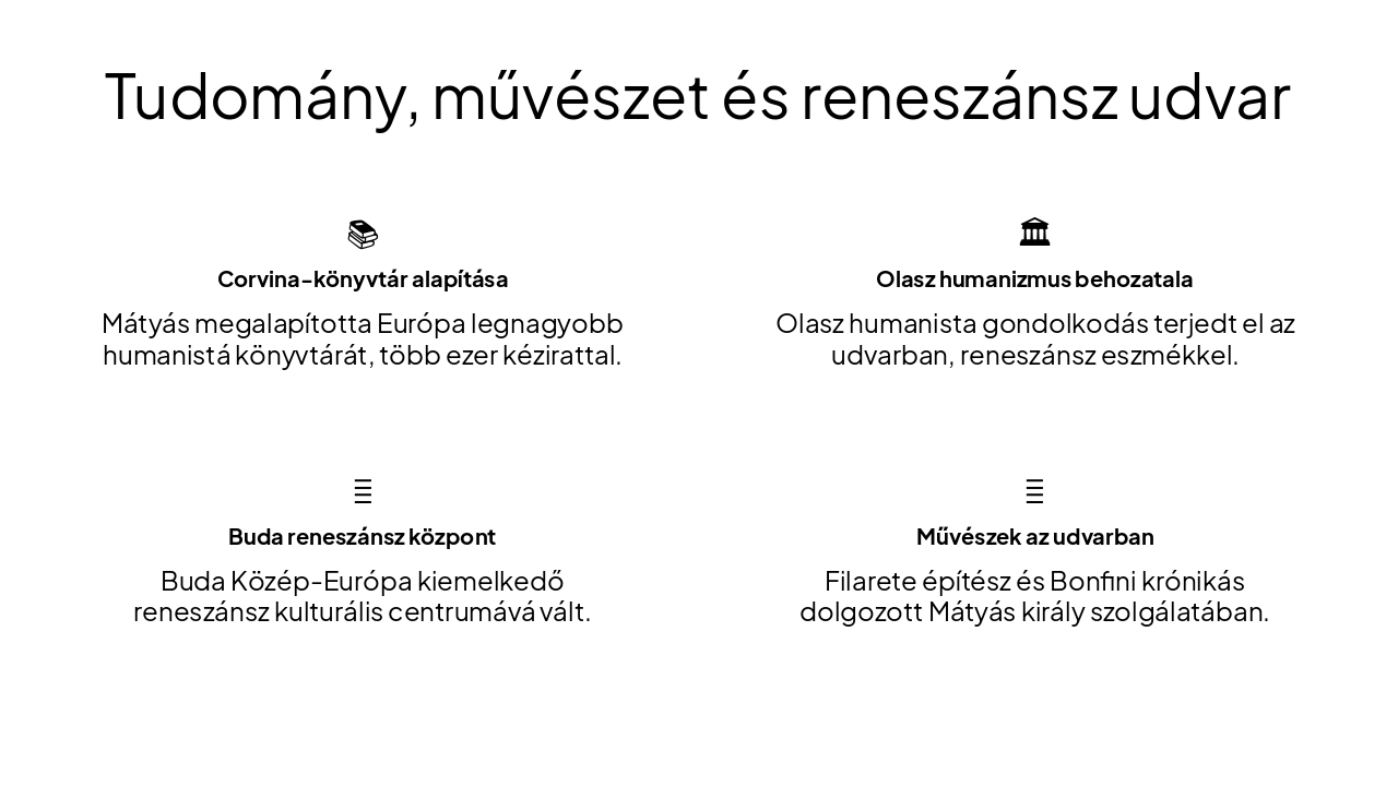 { "features": [ { "icon": "📚", "heading": "Corvina-könyvtár alapítása", "description": "Mátyás megalapította Európa legnagyobb humanistá könyvtárát, több ezer kézirattal." }, { "icon": "🏛️", "heading": "Olasz humanizmus behozatala", "description": "Olasz humanista gondolkodás terjedt el az udvarban, reneszánsz eszmékkel." }, { "icon": "🌆", "heading": "Buda reneszánsz központ", "description": "Buda Közép-Európa kiemelkedő reneszánsz kulturális centrumává vált." }, { "icon": "🎨", "heading": "Művészek az udvarban", "description": "Filarete építész és Bonfini krónikás dolgozott Mátyás király szolgálatában." } ] }