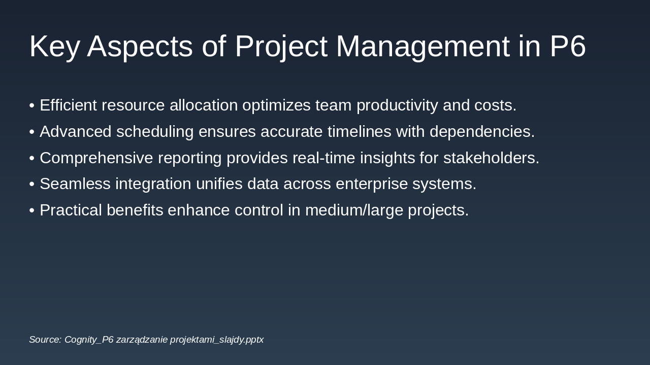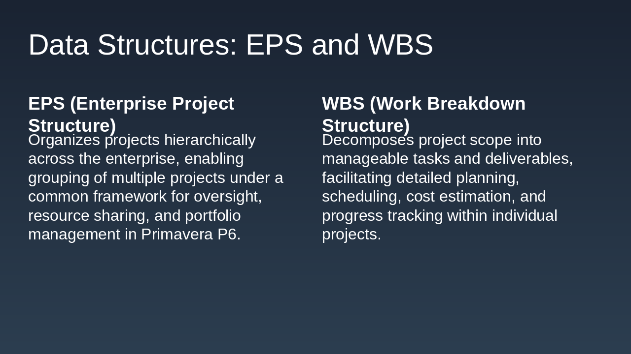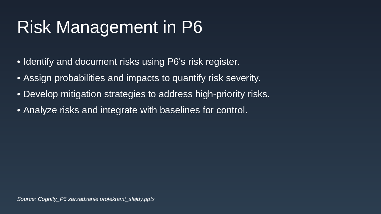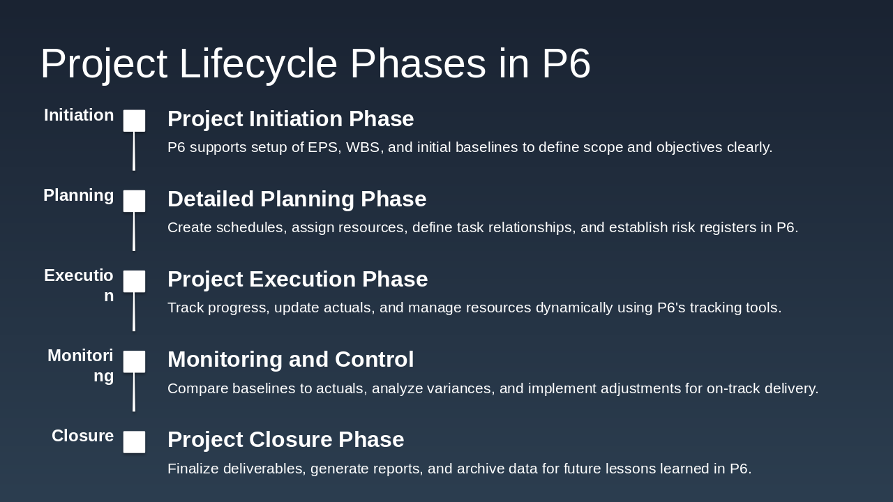 Initiation: Project Initiation Phase P6 supports setup of EPS, WBS, and initial baselines to define scope and objectives clearly. Planning: Detailed Planning Phase Create schedules, assign resources, define task relationships, and establish risk registers in P6. Execution: Project Execution Phase Track progress, update actuals, and manage resources dynamically using P6's tracking tools. Monitoring: Monitoring and Control Compare baselines to actuals, analyze variances, and implement adjustments for on-track delivery. Closure: Project Closure Phase Finalize deliverables, generate reports, and archive data for future lessons learned in P6.