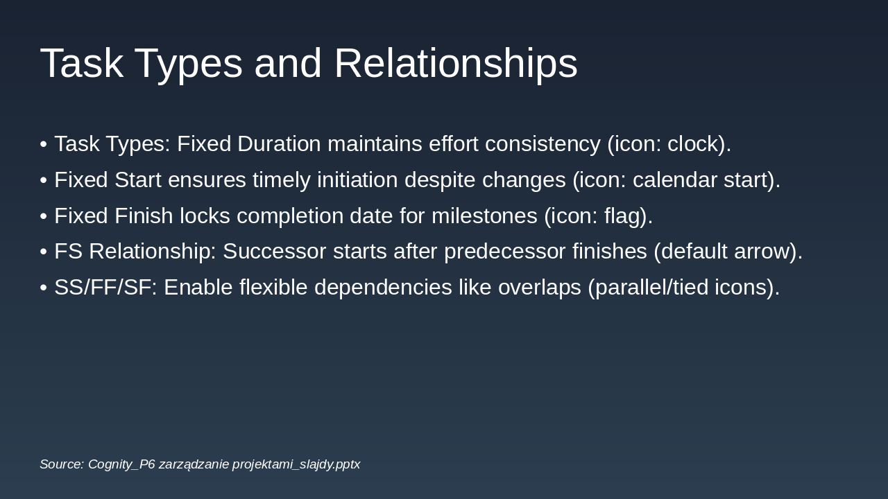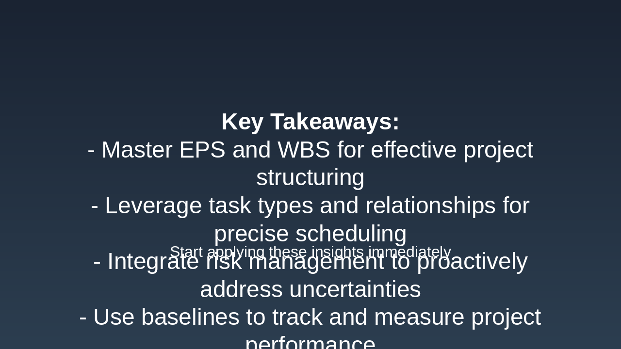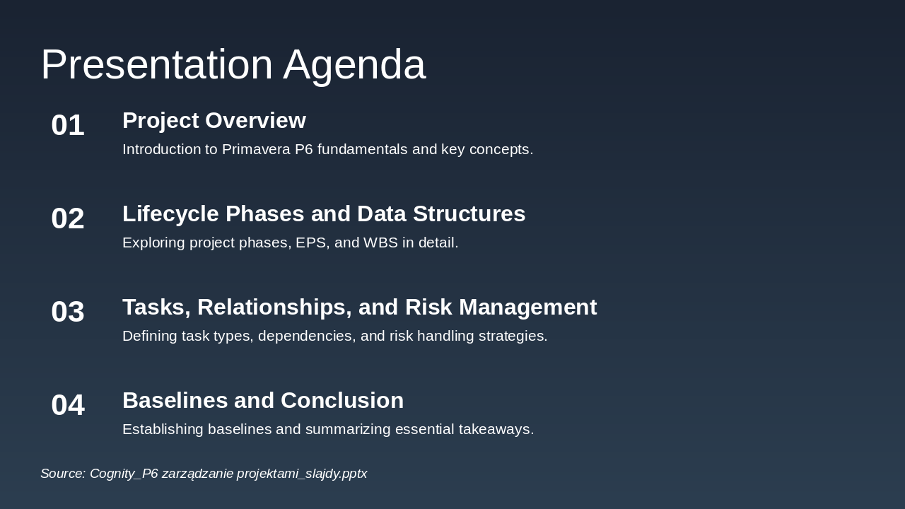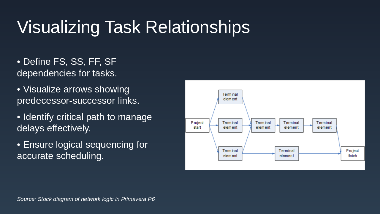 Initiation: Project Initiation Phase P6 supports setup of EPS, WBS, and initial baselines to define scope and objectives clearly. Planning: Detailed Planning Phase Create schedules, assign resources, define task relationships, and establish risk registers in P6. Execution: Project Execution Phase Track progress, update actuals, and manage resources dynamically using P6's tracking tools. Monitoring: Monitoring and Control Compare baselines to actuals, analyze variances, and implement adjustments for on-track delivery. Closure: Project Closure Phase Finalize deliverables, generate reports, and archive data for future lessons learned in P6.