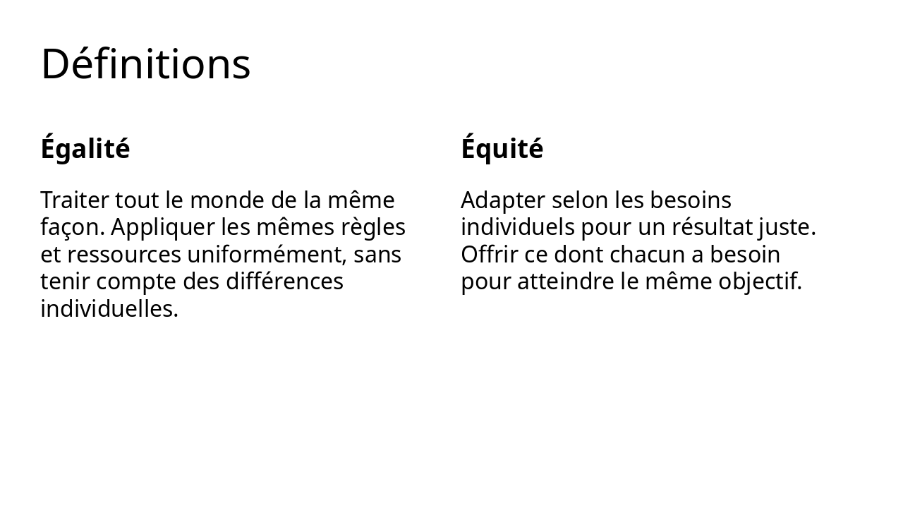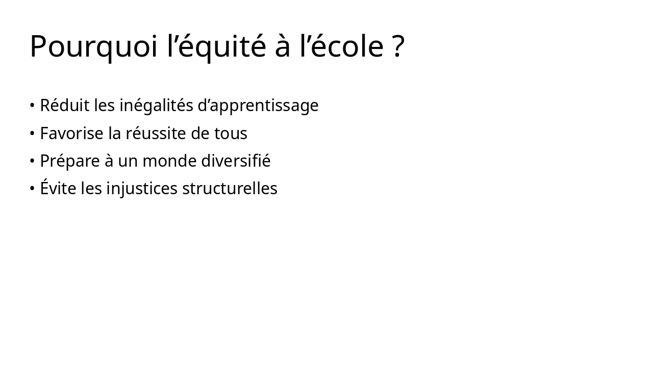 The title slide poses the question: "Égalité ou Équité à l’école?" (Equality or Equity in School?). The subtitle emphasizes: "Comprendre les différences pour éviter l’injustice" (Understand the differences to avoid injustice).