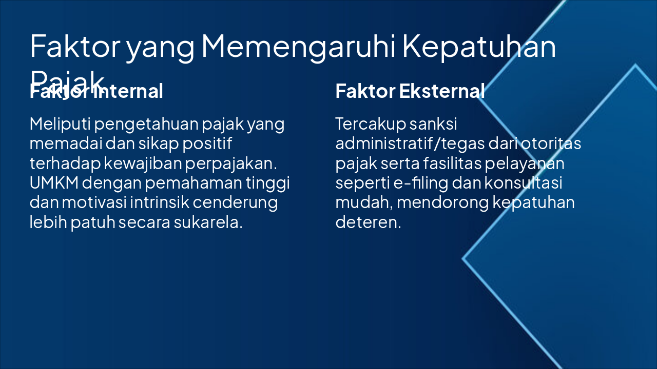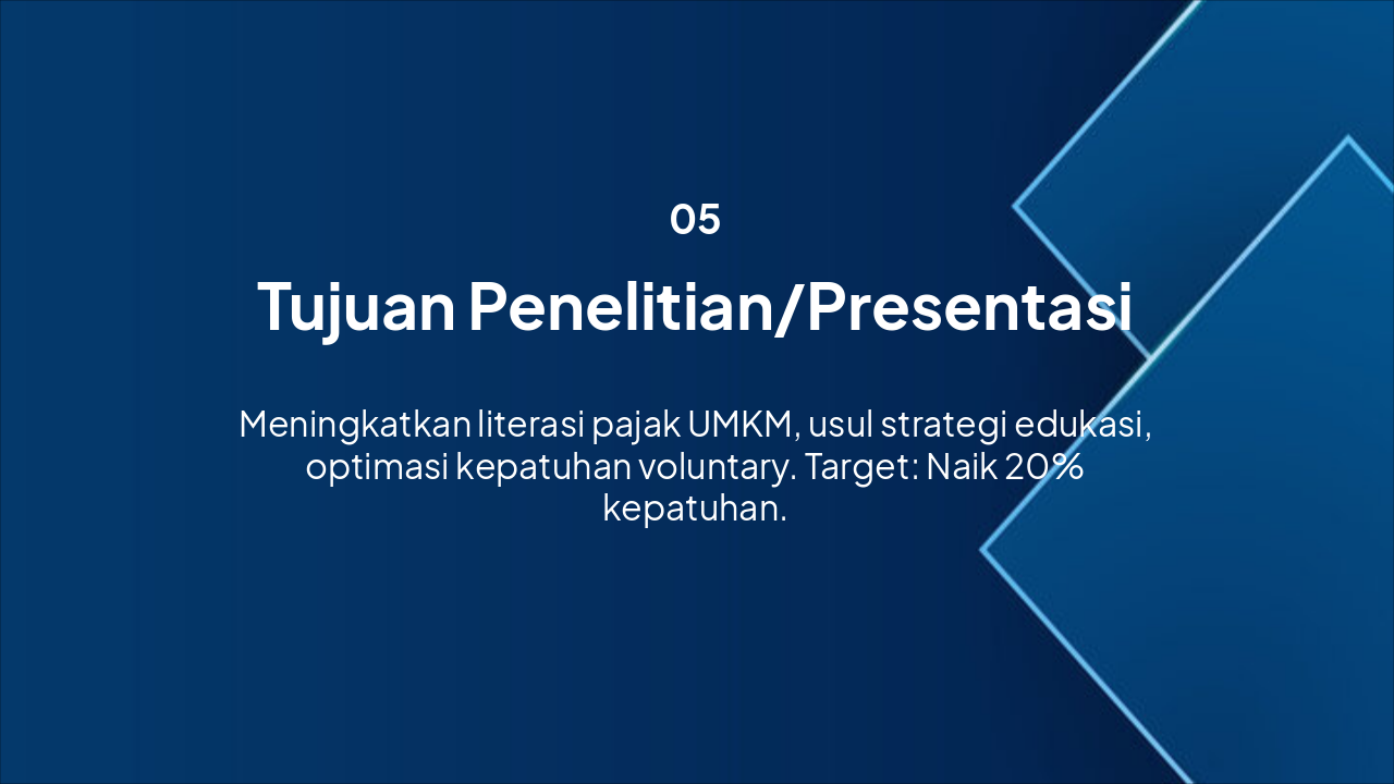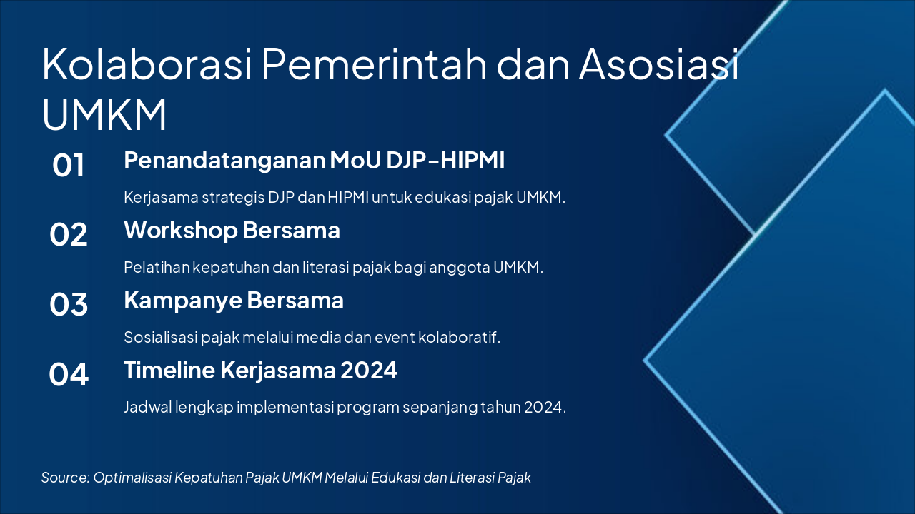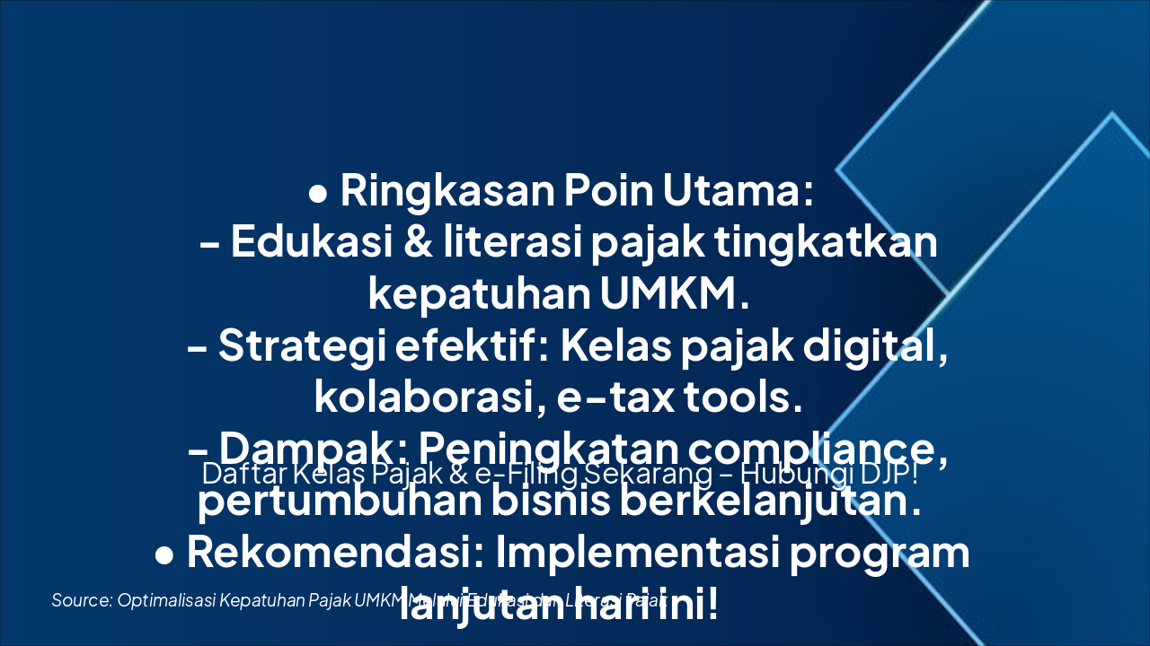 { "headers": [ "Tahap", "Platform", "Deskripsi" ], "rows": [ [ "Konten Video", "YouTube", "Pengenalan dasar pajak UMKM melalui video animasi edukatif singkat." ], [ "Webinar", "e-learning DJP", "Sesi interaktif live untuk diskusi mendalam kewajiban pajak." ], [ "App Interaktif", "e-learning DJP", "Simulasi perhitungan pajak dan modul belajar mandiri via aplikasi." ], [ "Quiz", "e-learning DJP", "Penilaian pemahaman dengan kuis online dan pemberian sertifikat." ] ] }