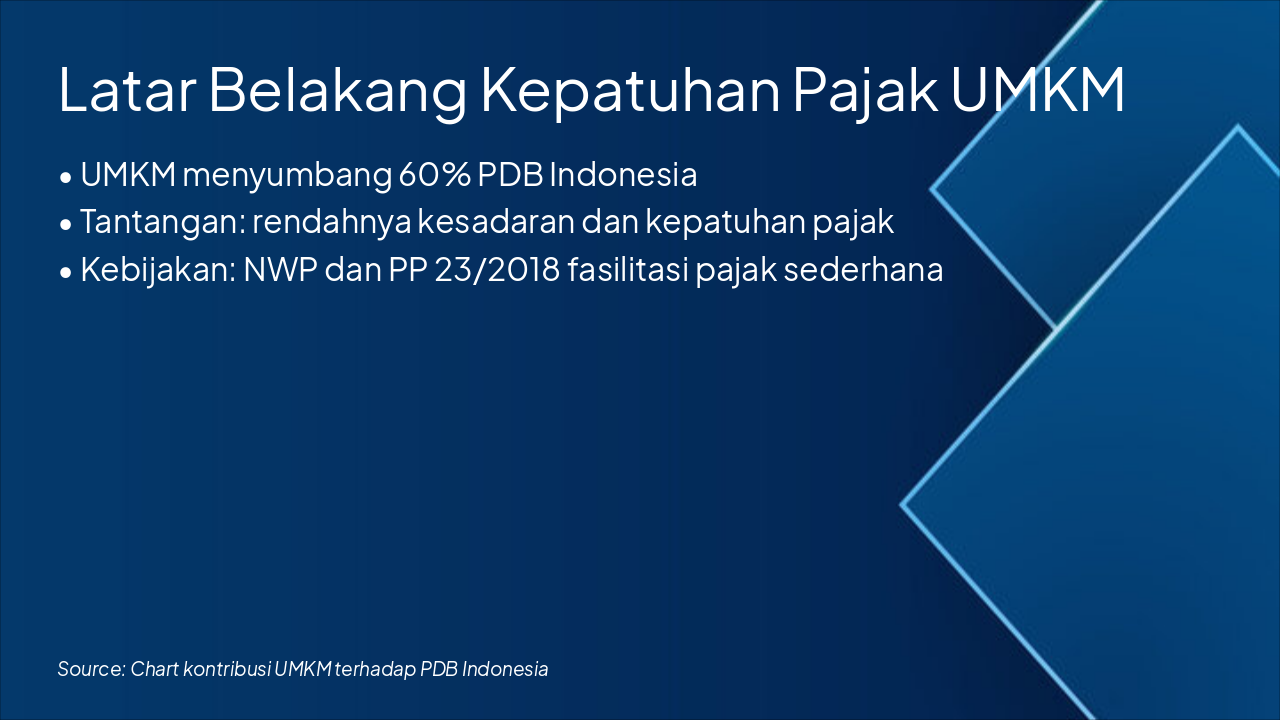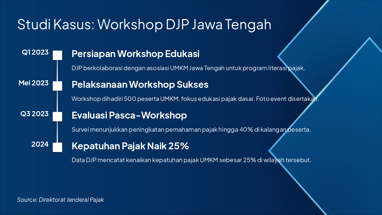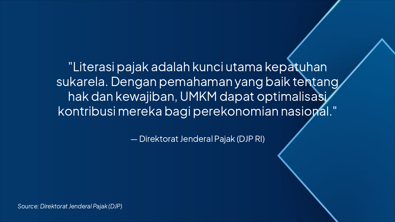 This slide outlines a digital tax education workflow for UMKM, starting with short animated videos on YouTube for basic tax introductions. It progresses to interactive webinars, app-based tax simulations and self-learning modules, and online quizzes with certificates on the DJP e-learning platform.