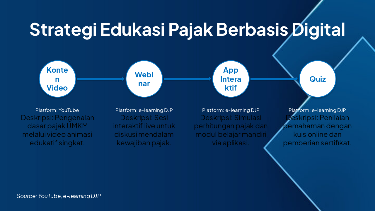 Alur strategi edukasi pajak digital: Mulai dari konten video di YouTube, dilanjutkan webinar, app interaktif, dan diakhiri quiz di platform e-learning DJP untuk meningkatkan literasi pajak UMKM.