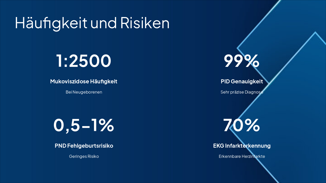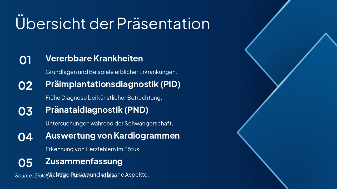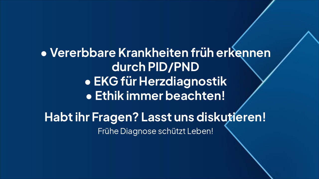 This title slide is titled "Vererbbare Krankheiten und Diagnostikverfahren" (Hereditary Diseases and Diagnostic Procedures). The subtitle introduces PID, PND, and cardiogram evaluation for 10th grade students.