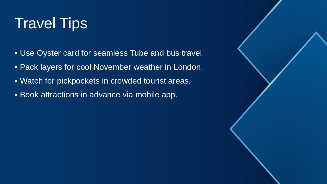 The Trip Overview slide outlines a 5-day London itinerary, starting with an introduction from arrival to farewell, followed by detailed daily plans for Days 1-3 covering central sights, royal sites, and Thames icons, and Days 4-5 focusing on culture, markets, shopping, and a farewell. It also includes practical travel tips on transport, weather, and customs, plus a summary of total costs for flights, accommodations, and activities.