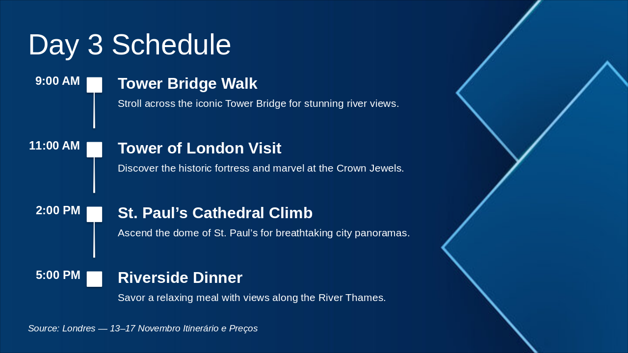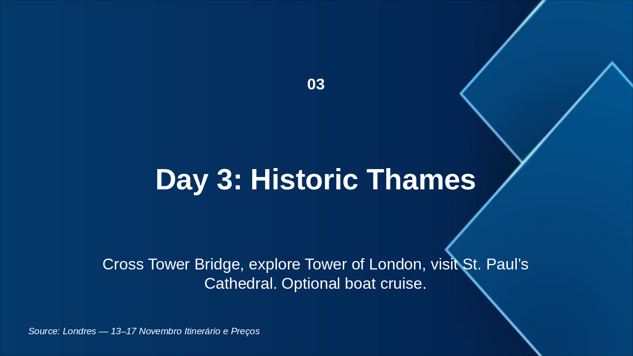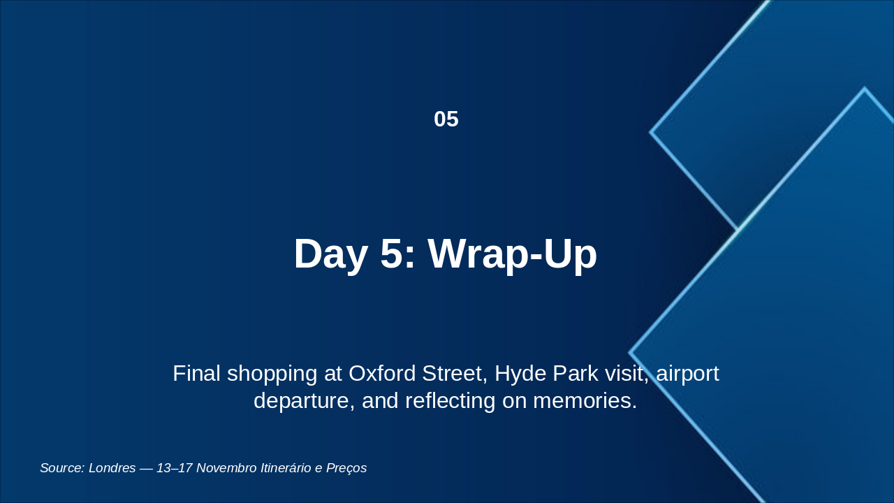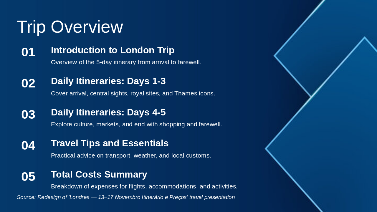 Breakdown of expenses for flights, accommodations, and activities. Source: Redesign of 'Londres — 13–17 Novembro Itinerário e Preços' travel presentation