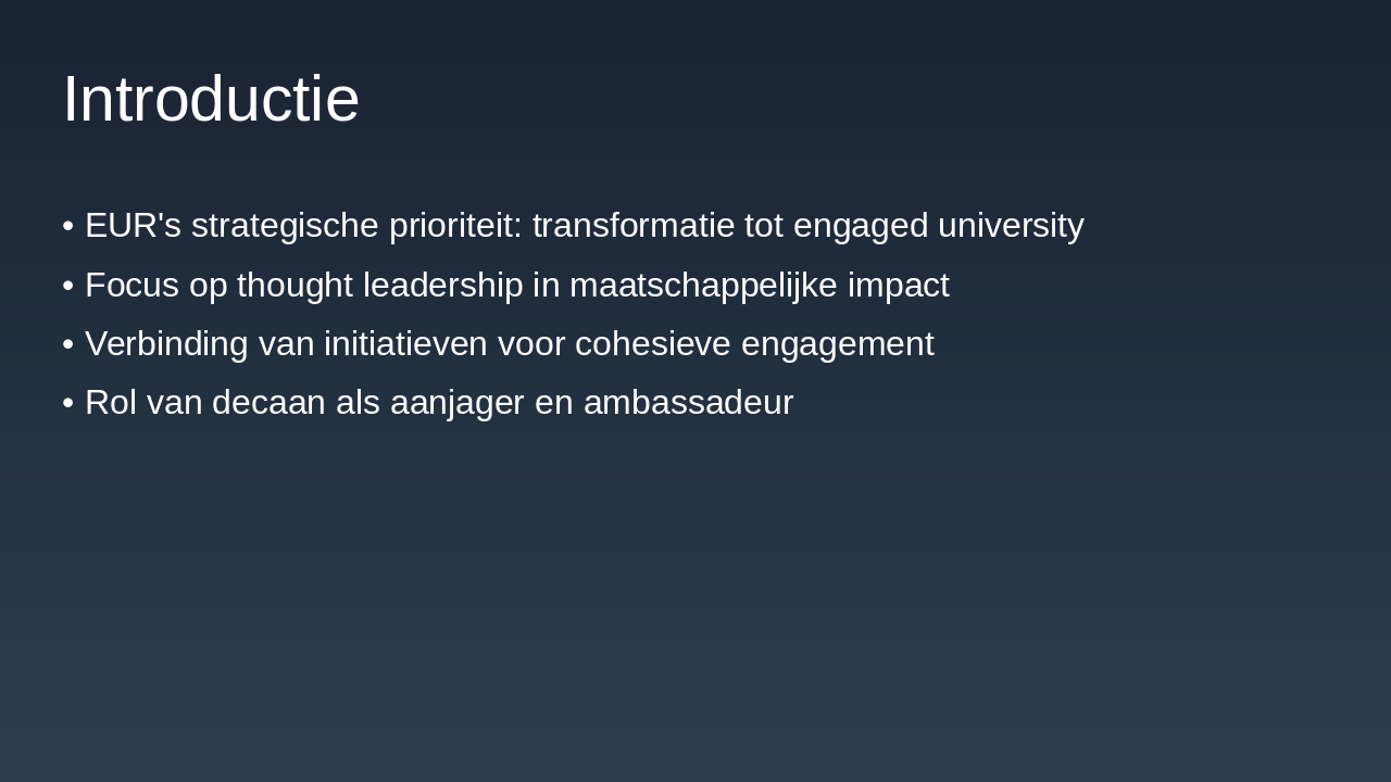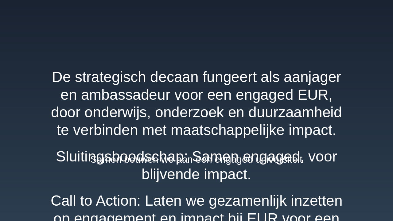 Samenvatting van de rol van de strategisch decaan. Oproep tot gezamenlijke inzet voor engagement en impact bij EUR.