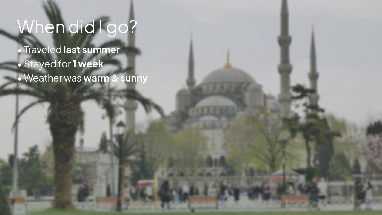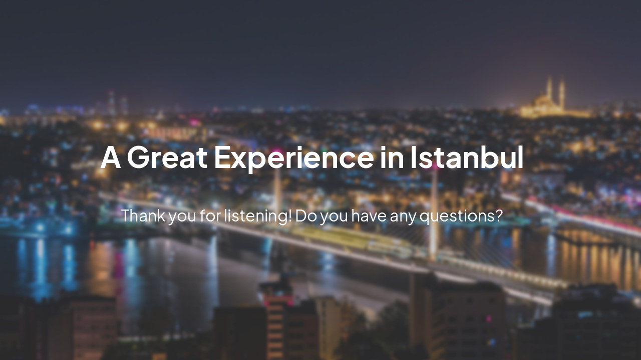 Create an 8-slide professional, modern, elegant PowerPoint for a first-year university English speaking assessment. Topic: A city I have visited before – Istanbul, Turkey Design: - Theme: subtle Turkish-inspired patterns - Colors: soft beige, warm brown, light blue, gold accents - Fonts: Calibri or Segoe UI - Clean layout, not crowded - Add icons (travel, food, weather) - Use fade animations only - High-quality images on each slide (Hagia Sophia, Bosphorus, mosques, Turkish food) Slides (exactly 8): Slide 1 – Introduction Title: Introduction Bullets: - Name: [Student Name] - City: **Istanbul, Turkey** - Topic: **Travel experience** Speaker notes: simple intro, name, topic explanation Slide 2 – Where is it? Bullets: - **Turkey** (country) - Between **Europe & Asia** - Near **Bosphorus Strait** - Major **historical city** Speaker notes: present simple sentences Slide 3 – Why did I go? Bullets: - **Vacation** with family - Interested in **history & culture** - Wanted to try **Turkish food** Speaker notes: present perfect sentences Slide 4 – When did I go? Bullets: - **Last summer** - Stayed for **1 week** - Weather: **warm & sunny** Speaker notes: past simple Slide 5 – Activities Bullets: - Visited **Hagia Sophia** - Took a **Bosphorus cruise** - Explored **Grand Bazaar** - Tried **local food** Speaker notes: past simple detailed explanation Slide 6 – Advice for travelers Bullets: - You should **visit early** - You should try **street food** - You shouldn’t **ignore local culture** - You can use **public transport** Speaker notes: use modals (should, shouldn’t, can) Slide 7 – Istanbul vs Doha (split layout) Left (Istanbul): - More **historical sites** - Cooler **climate** - More **tourists** Right (Doha): - More **modern buildings** - Hotter **weather** - Less **crowded** Speaker notes: use comparatives (more, less, hotter, cooler) Slide 8 – Conclusion Bullets: - **Great experience** - Learned about **culture** - Want to **visit again** - Thank you for listening - Any questions? Speaker notes: short summary and closing Ensure: - Bullet points only (3–5 per slide) - Bold keywords - Speaker notes in simple English, full sentences, easy to memorize - Attractive final slide background image