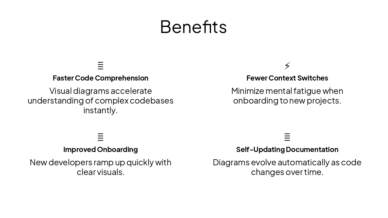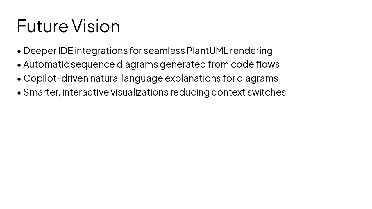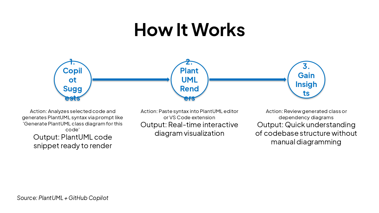 This slide illustrates the simple 3-step workflow: Copilot generates PlantUML syntax from your code, PlantUML renders it instantly, providing quick visualizations like class and dependency diagrams to reduce context switching.
