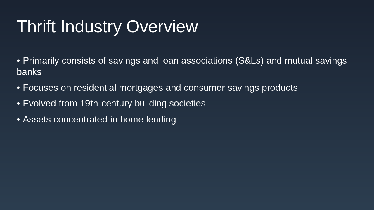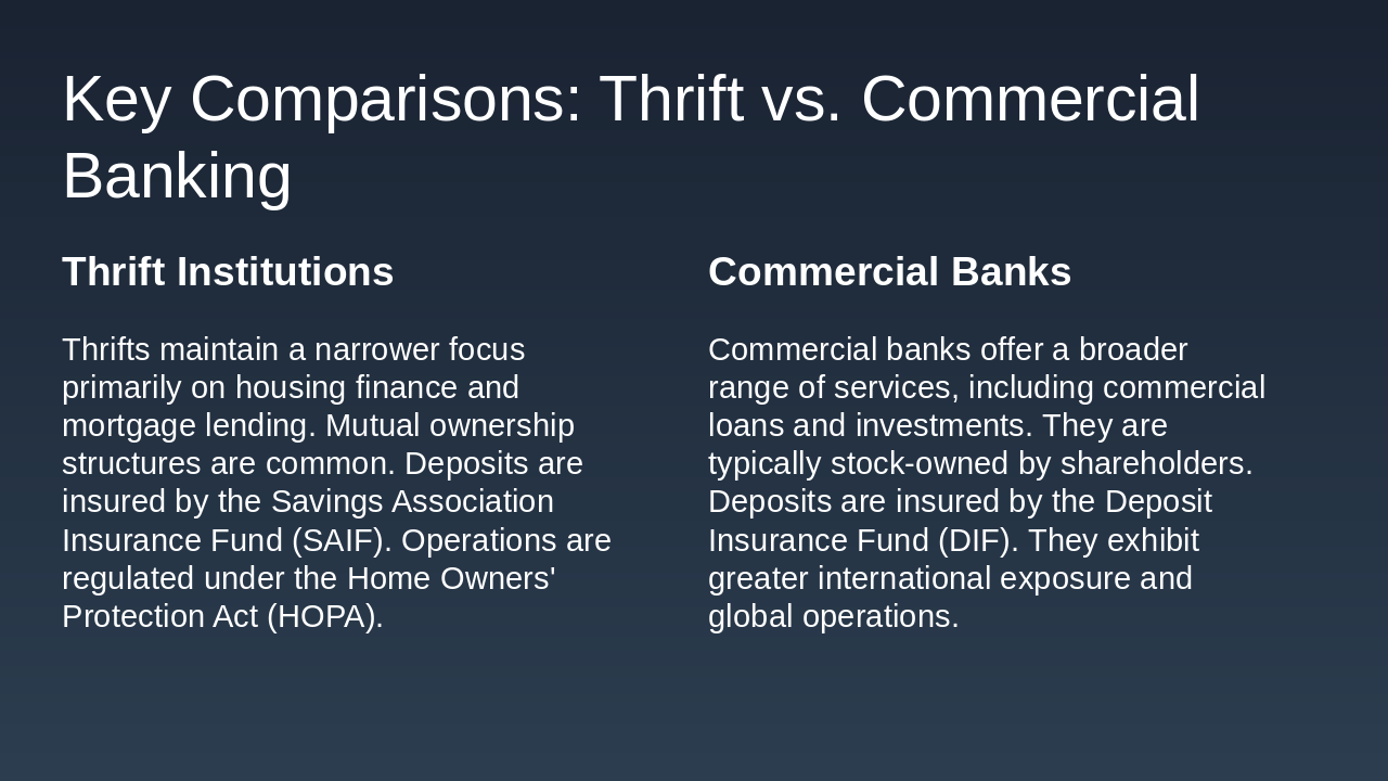 This title slide introduces the topic of comparing the regulation and structure of the thrift industry to that of commercial banking. It features a subtitle that highlights an exploration of organizational frameworks, regulatory oversight, and key differences within the U.S. context.