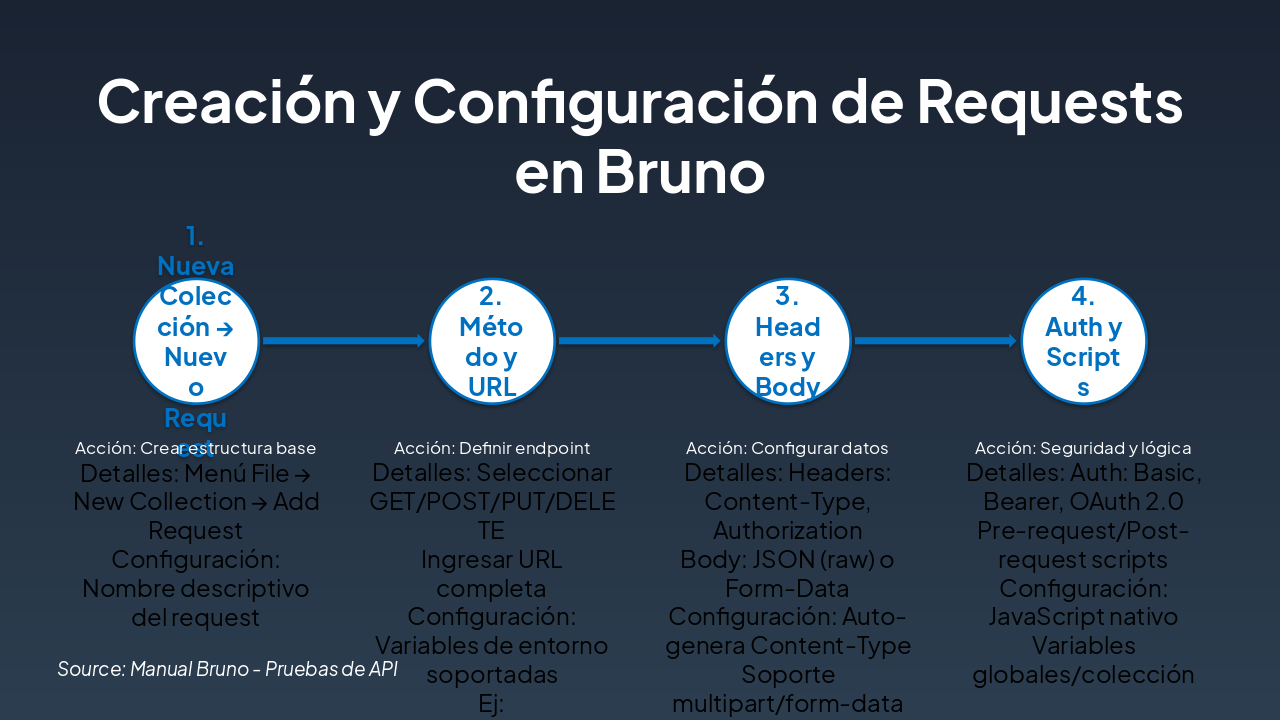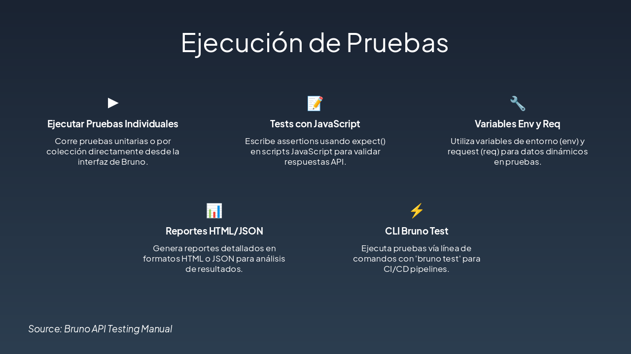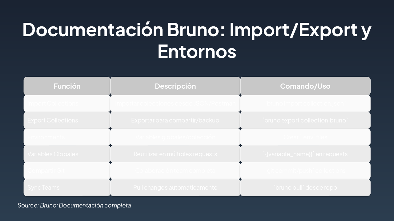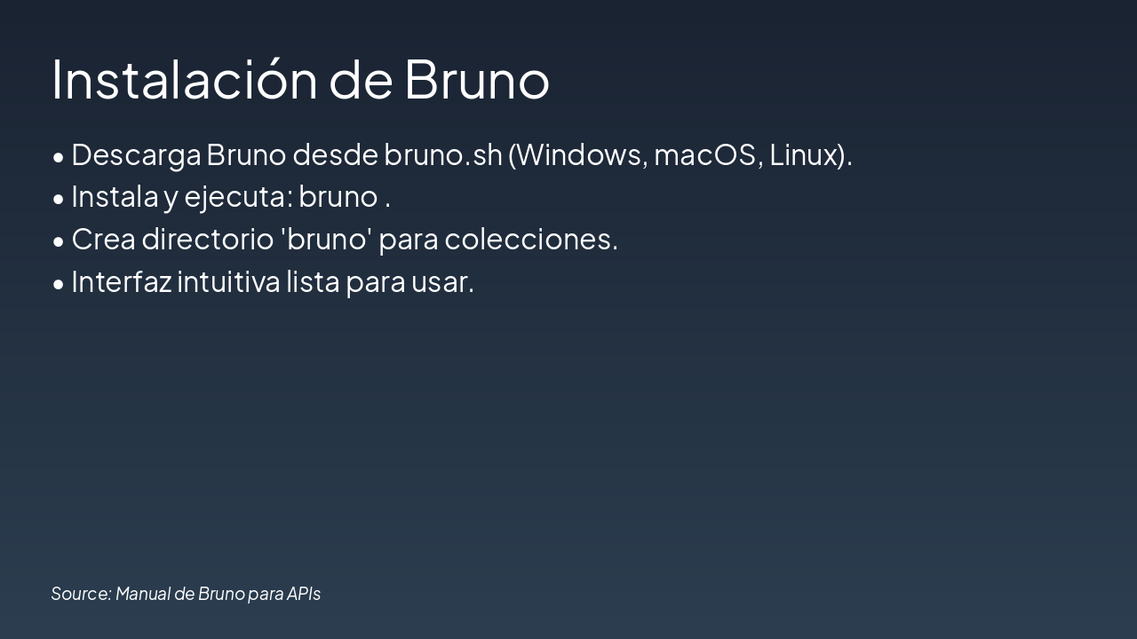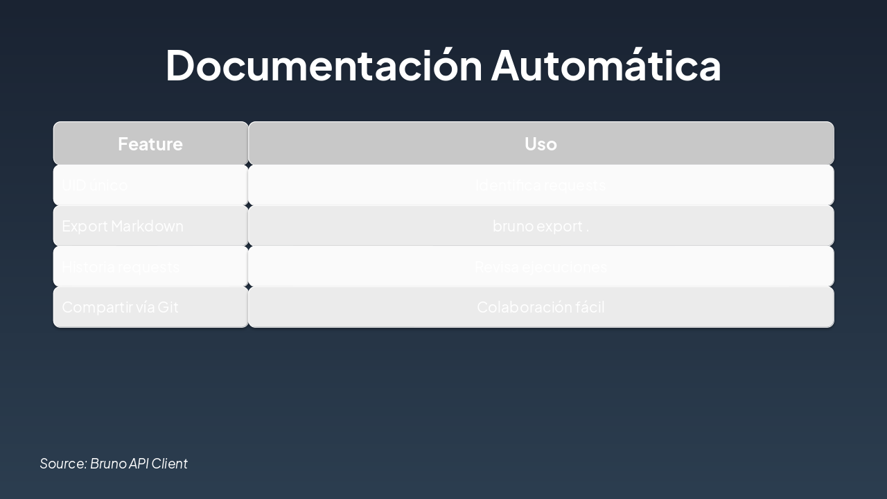 Generar documentación automática y explorar features avanzadas. Source: Bruno API Tool Manual Presentation