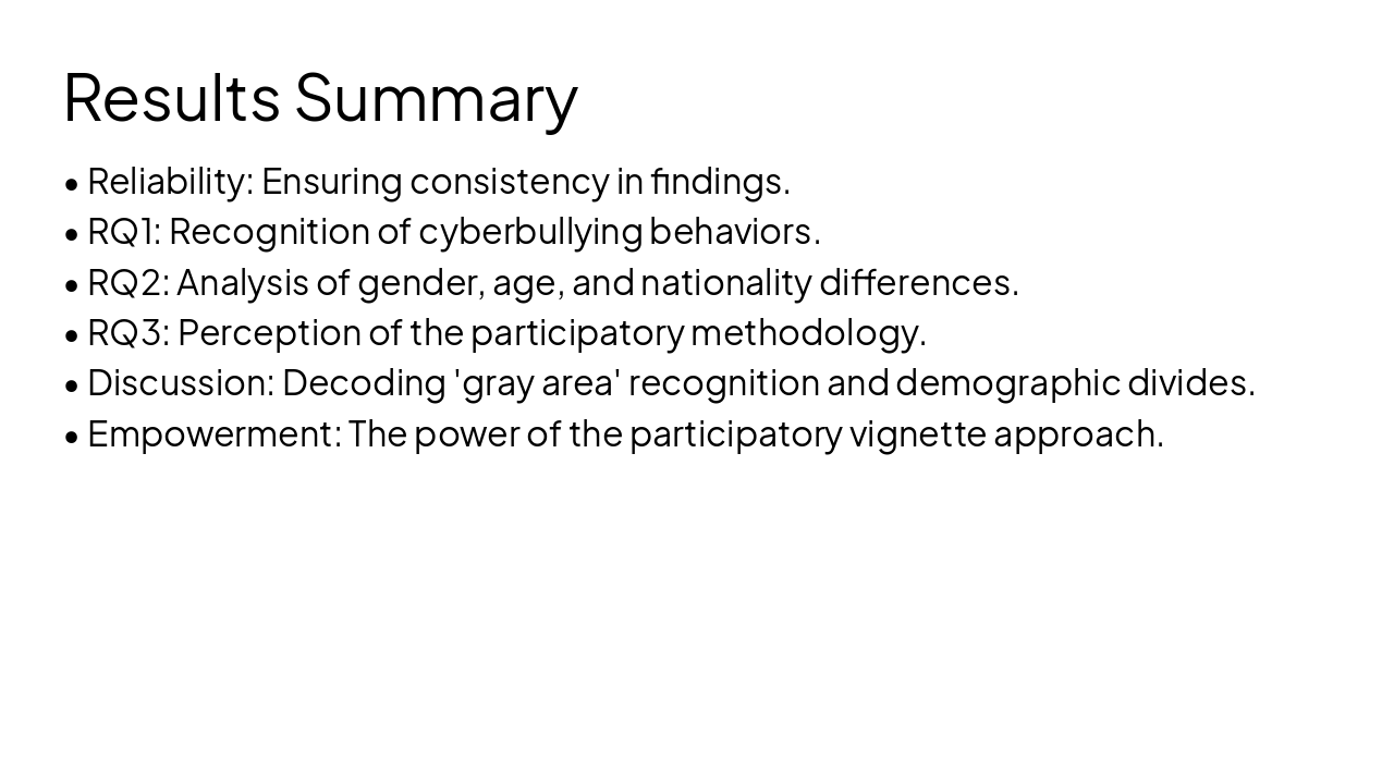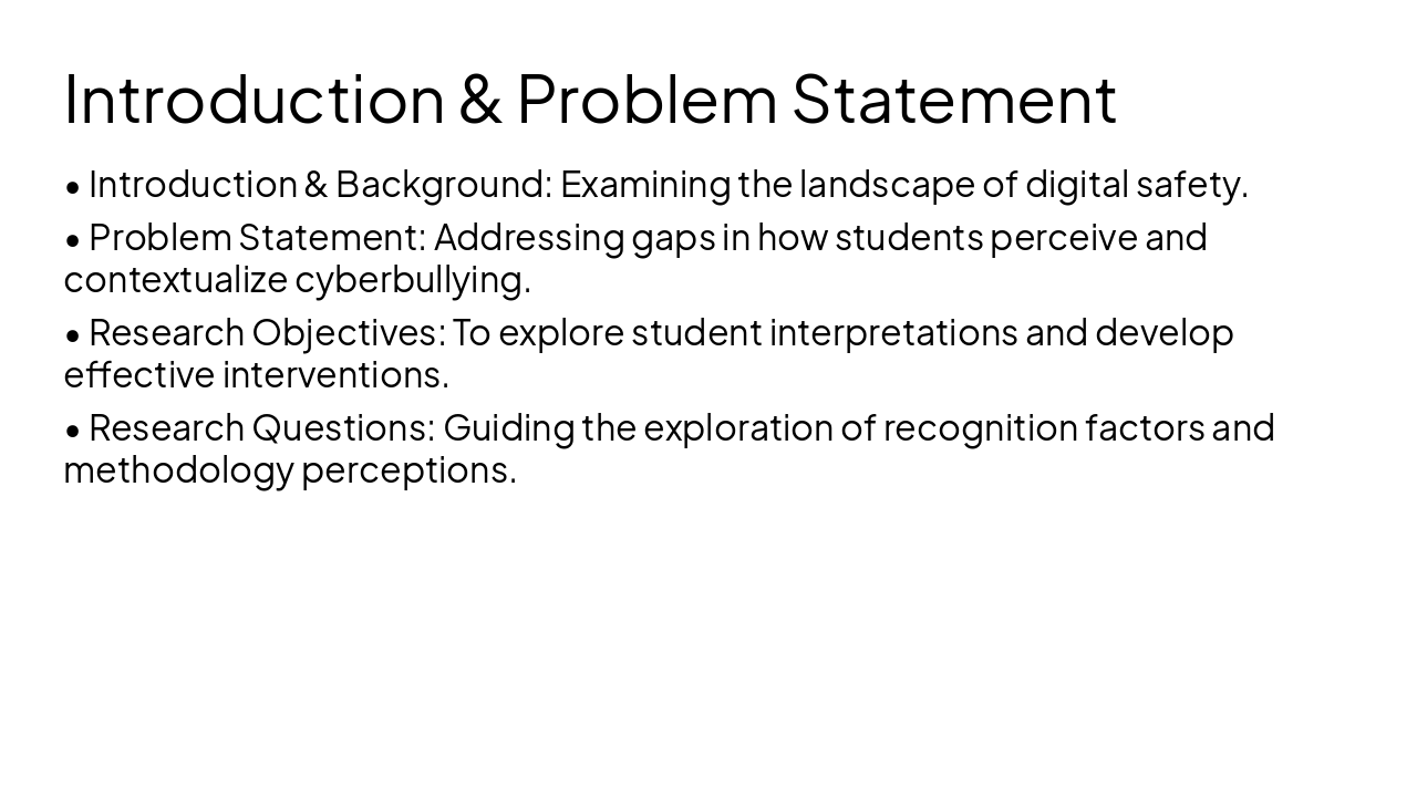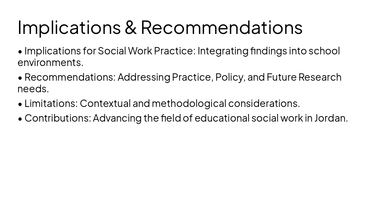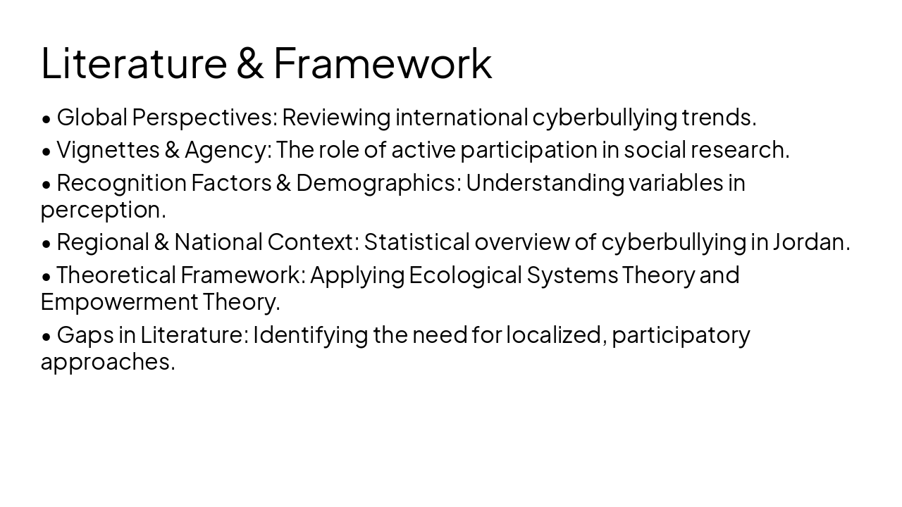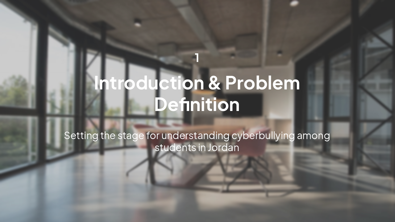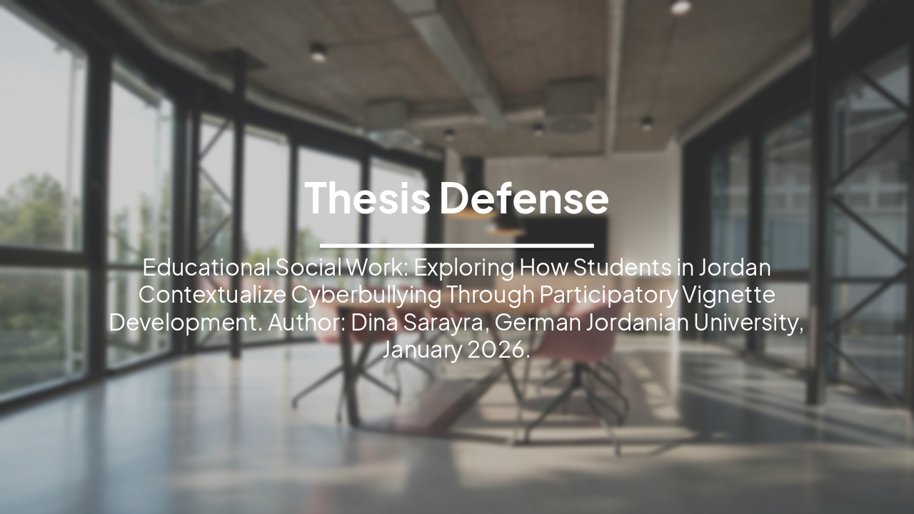Redesign an existing thesis defense PowerPoint to be professional and sleek while keeping ALL content exactly the same (no text changes, no figure/table changes). Topic: Educational Social Work: Exploring How Students in Jordan Contextualize Cyberbullying Through Participatory Vignette Development. Author: Dina Sarayra, German Jordanian University, January 2026. Slides include: title slide, roadmap, introduction & background, problem statement, research objectives & questions, literature review (global perspectives, vignettes & agency, recognition factors, demographics), regional & national context statistics, theoretical framework (Ecological Systems Theory and Empowerment Theory), gaps in literature, methodology (two-stage participatory vignette design), sampling & context (Madrasati Initiative), data collection & instrument, data analysis methods, ethical considerations, results (reliability, RQ1 recognition, RQ2 gender/age/nationality differences, RQ3 methodology perception), discussion (gray area recognition, demographic divides, participatory vignette power), implications for social work practice, recommendations (practice, policy, research), limitations, contributions, conclusion, and final thank you slide. Design requirements: thesis-defense style, minimalistic academic theme, navy/teal color palette with subtle gradients, modern sans-serif fonts, clean layouts, consistent icons, professional charts styling, strong visual hierarchy, elegant section divider slides, polished tables and figure styling. Keep all original structure, data, and wording but upgrade visual design.