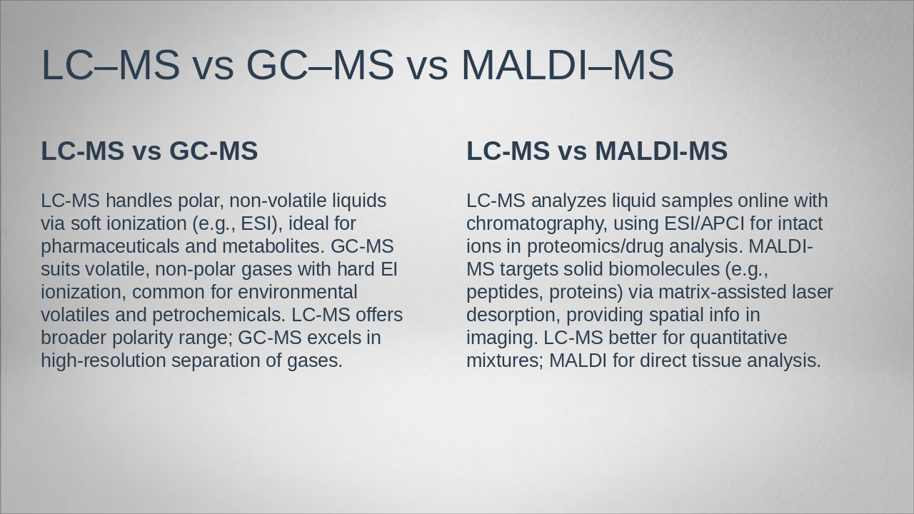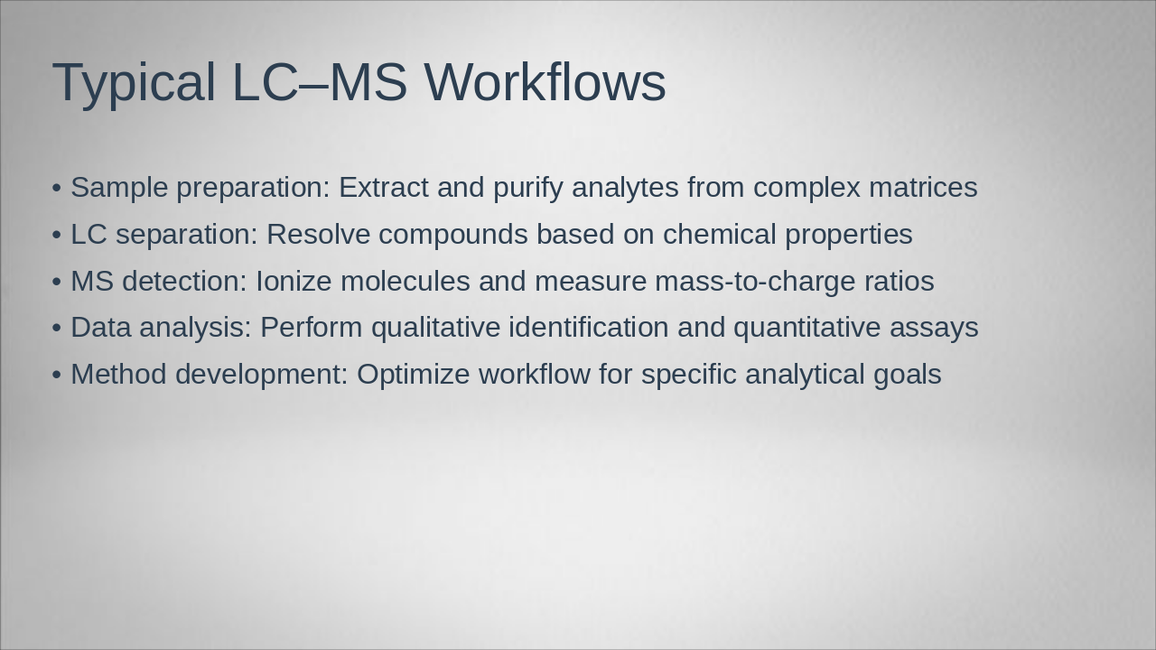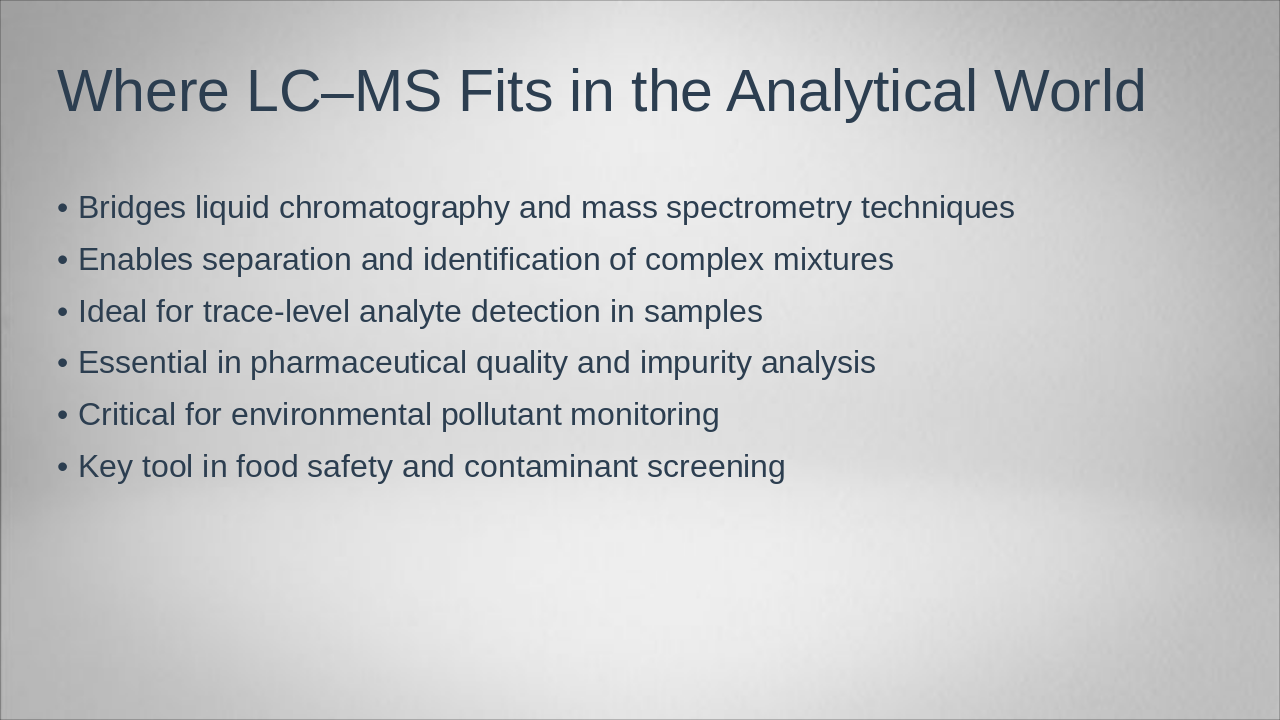 The slide titled "Introduction to LC–Mass Spectrometry" serves as an introductory overview of this analytical technique. It highlights LC–Mass Spectrometry as a powerful method that integrates liquid chromatography for separation with mass spectrometry for detection, ideal for analyzing complex samples.