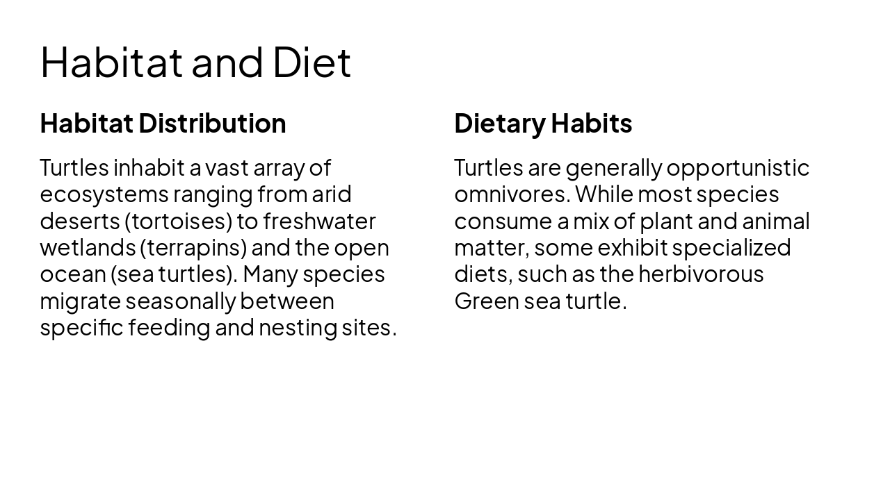 Dietary Habits Turtles are generally opportunistic omnivores. While most species consume a mix of plant and animal matter, some exhibit specialized diets, such as the herbivorous Green sea turtle.