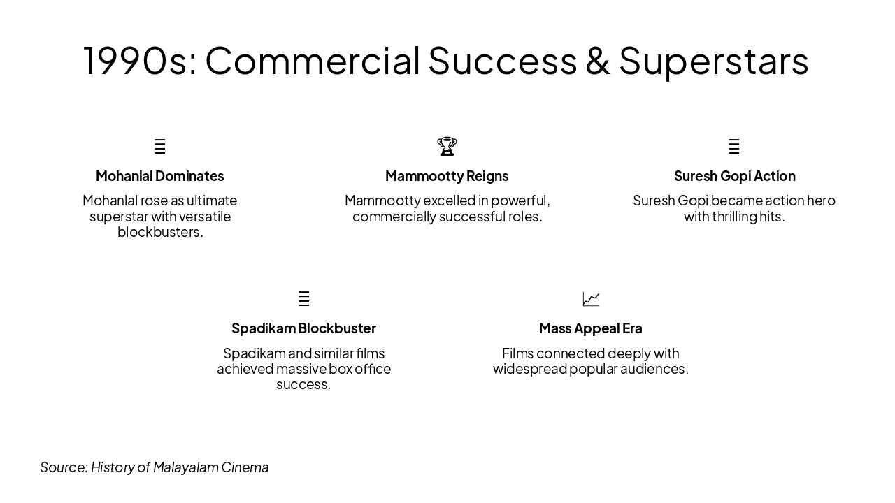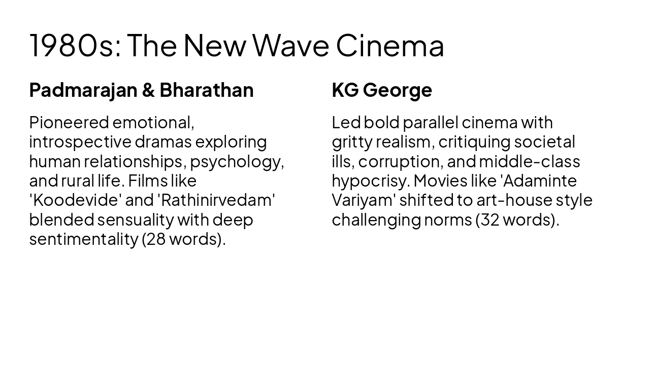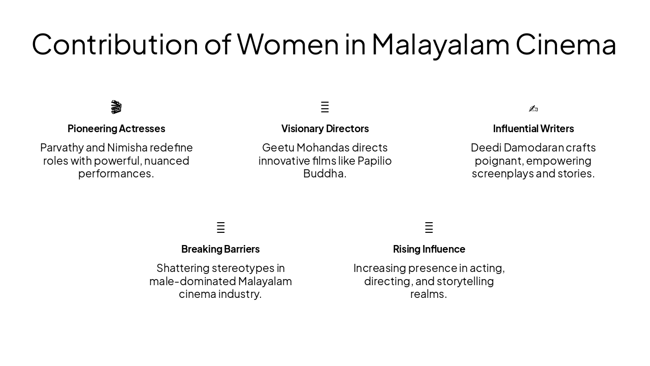 { "features": [ { "icon": "👩🎬", "heading": "Pioneering Actresses", "description": "Parvathy and Nimisha redefine roles with powerful, nuanced performances." }, { "icon": "🎥", "heading": "Visionary Directors", "description": "Geetu Mohandas directs innovative films like Papilio Buddha." }, { "icon": "✍️", "heading": "Influential Writers", "description": "Deedi Damodaran crafts poignant, empowering screenplays and stories." }, { "icon": "🚀", "heading": "Breaking Barriers", "description": "Shattering stereotypes in male-dominated Malayalam cinema industry." }, { "icon": "🌟", "heading": "Rising Influence", "description": "Increasing presence in acting, directing, and storytelling realms." } ] }