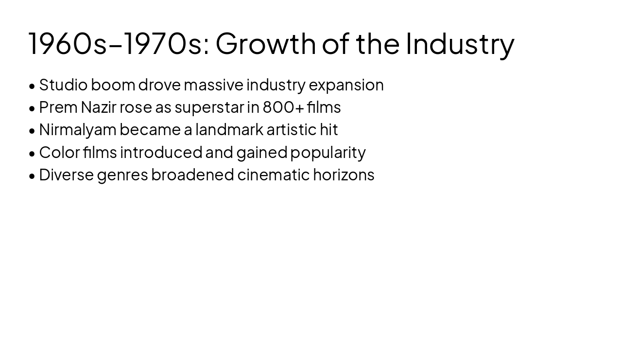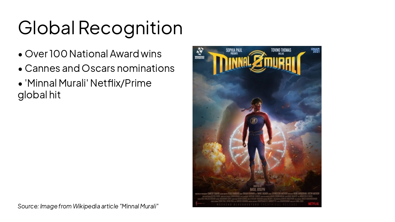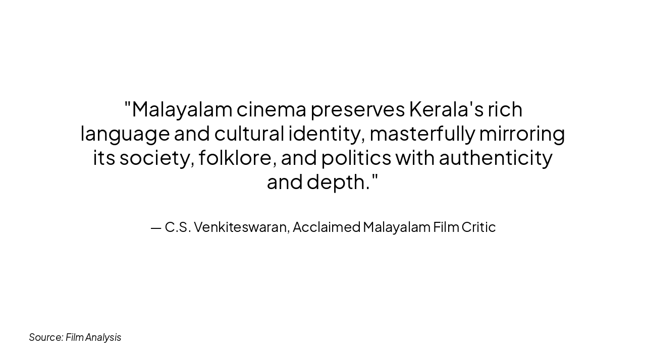 The slide "Contribution of Women in Malayalam Cinema" features a grid highlighting pioneering actresses like Parvathy and Nimisha, visionary directors such as Geetu Mohandas, and influential writers like Deedi Damodaran. It emphasizes their role in breaking stereotypes, shattering barriers, and rising influence across acting, directing, and storytelling in the male-dominated industry.