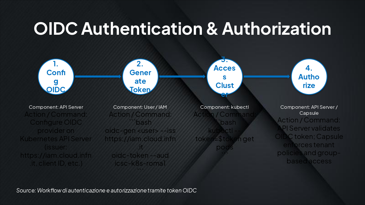 { "headers": [ "Step", "Component", "Action / Command" ], "rows": [ [ "1. Config OIDC", "API Server", "Configure OIDC provider on Kubernetes API Server (issuer: https://iam.cloud.infn.it, client ID, etc.)" ], [ "2. Generate Token", "User / IAM",