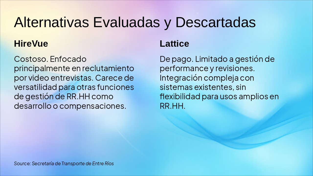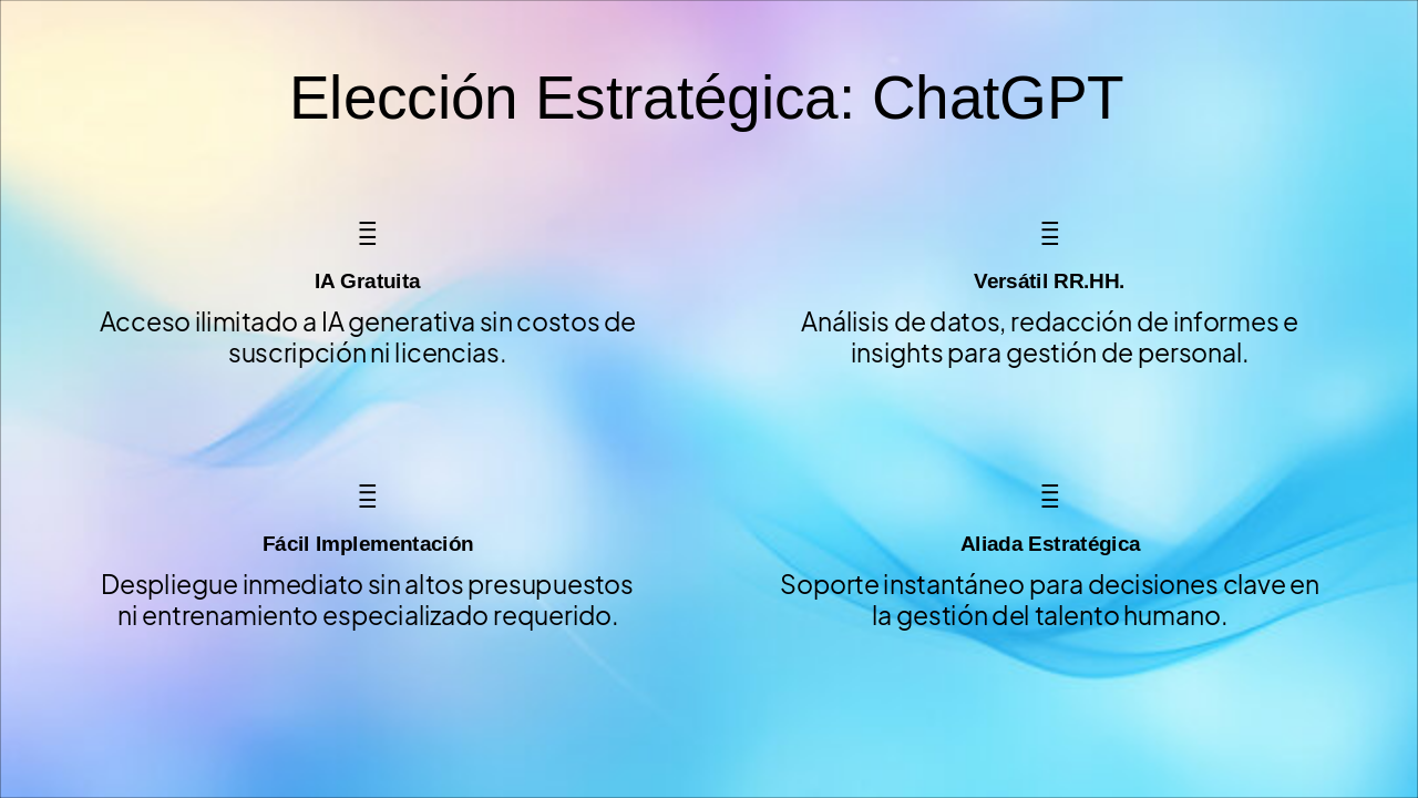 { "features": [ { "icon": "💸", "heading": "IA Gratuita", "description": "Acceso ilimitado a IA generativa sin costos de suscripción ni licencias." }, { "icon": "🔄", "heading": "Versátil RR.HH.", "description": "Análisis de datos, redacción de informes e insights para gestión de personal." }, { "icon": "🚀", "heading": "Fácil Implementación", "description": "Despliegue inmediato sin altos presupuestos ni entrenamiento especializado requerido." }, { "icon": "🤖", "heading": "Aliada Estratégica", "description": "Soporte instantáneo para decisiones clave en la gestión del talento humano." } ] }