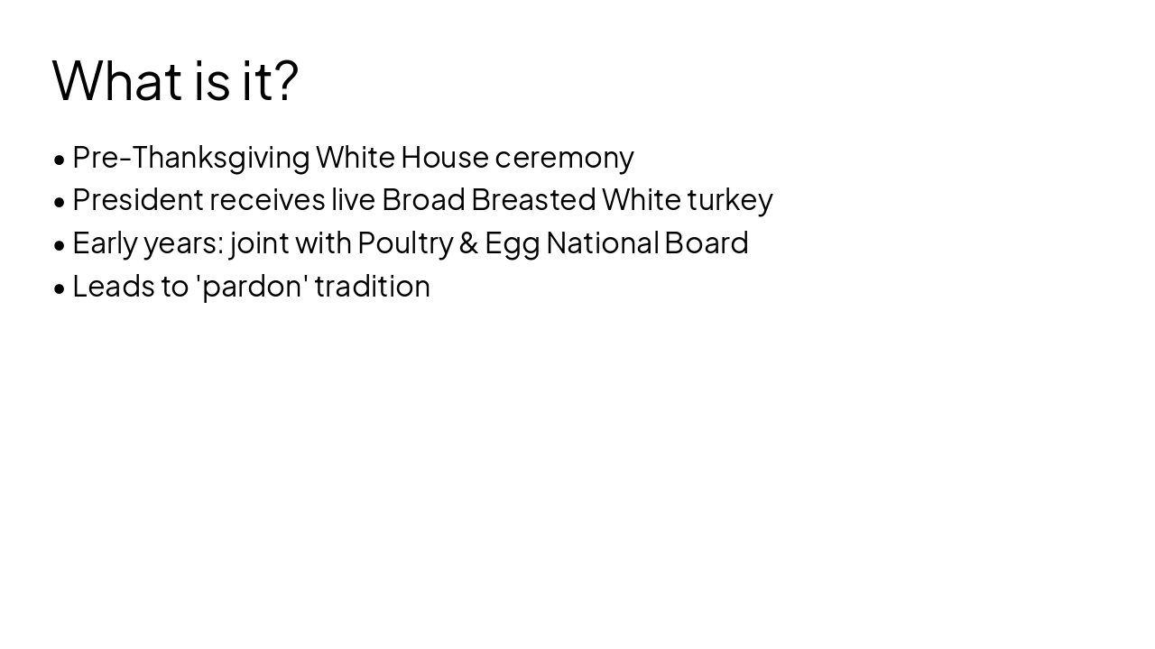 This is the title slide for the "National Thanksgiving Turkey Presentation." The subtitle describes the annual White House ceremony where a live turkey is presented to the President, with 🦃🇺🇸 emojis.
