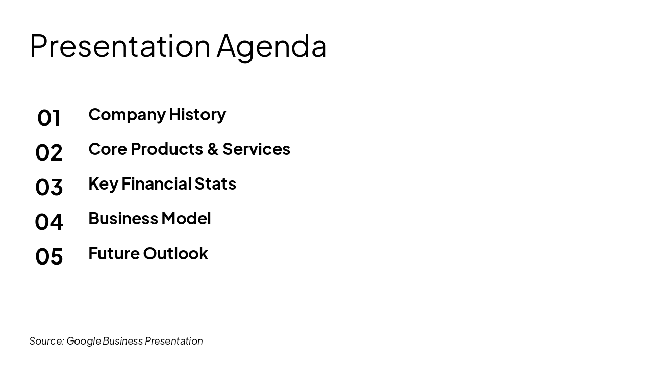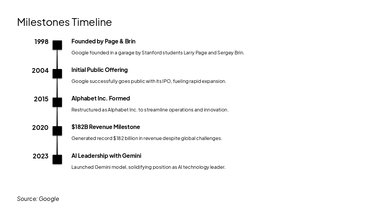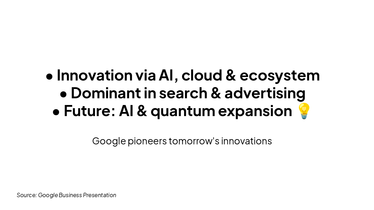 { "features": [ { "icon": "π", "heading": "Search Dominance", "description": "90%+ market share drives core revenue streams." }, { "icon": "πΊ", "heading": "YouTube Platform", "description": "2.5 billion monthly active users worldwide." }, { "icon": "π€", "heading": "Android Ecosystem", "description": "Powers 3 billion+ devices globally." }, { "icon": "βοΈ", "heading": "Google Cloud", "description": "$33B annual revenue from enterprise services." }, { "icon": "πΌ", "heading": "Google Workspace", "description": "Collaboration tools like Slides for teams." } ] }