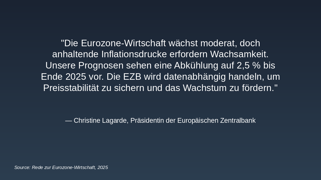 > Die Eurozone-Wirtschaft wächst moderat, doch anhaltende Inflationsdrucke erfordern Wachsamkeit. Unsere Prognosen sehen eine Abkühlung auf 2,5 % bis Ende 2025 vor. Die EZB wird datenabhängig handeln, um Preisstabilität zu sichern und das Wachstum zu fördern.