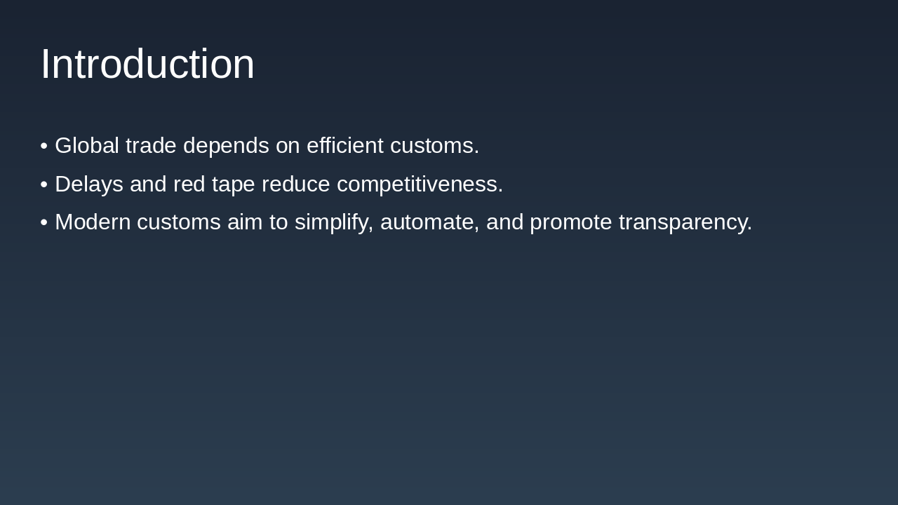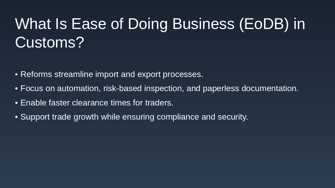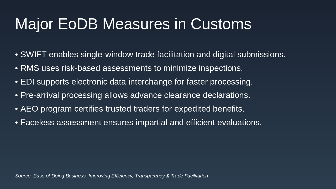 The slide outlines key measures in customs to enhance Ease of Doing Business (EoDB), including SWIFT for single-window digital trade facilitation, RMS for risk-based inspections, and EDI for faster electronic data interchange. Additional initiatives feature pre-arrival processing for advance declarations, the AEO program for trusted traders' expedited benefits, and faceless assessments to ensure impartial efficiency.