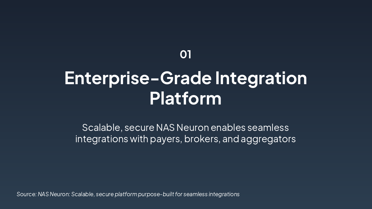 The slide titled "Your Strategic Partner" features "NAS Neuron" as the main text. Its subtitle describes it as an "Enterprise-Grade Integration Platform for Healthcare Excellence."
