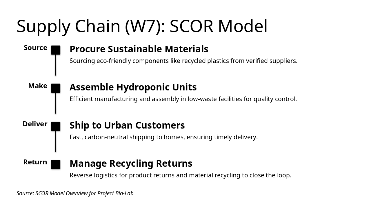 Source: Procure Sustainable Materials Sourcing eco-friendly components like recycled plastics from verified suppliers. Make: Assemble Hydroponic Units Efficient manufacturing and assembly in low-waste facilities for quality control. Deliver: Ship to Urban Customers Fast, carbon-neutral shipping to homes, ensuring timely delivery. Return: Manage Recycling Returns Reverse logistics for product returns and material recycling to close the loop.