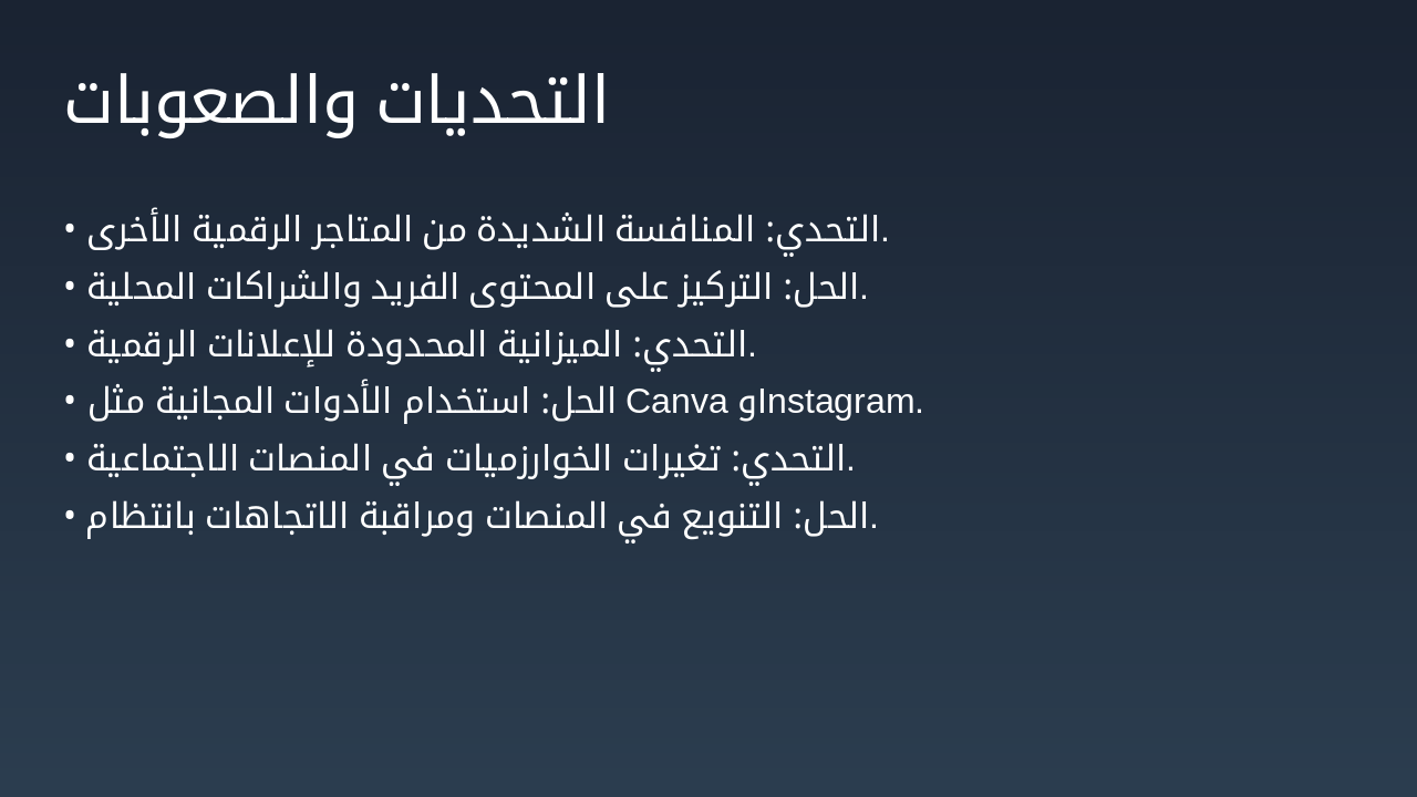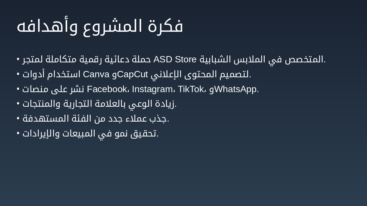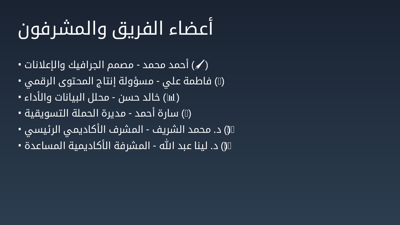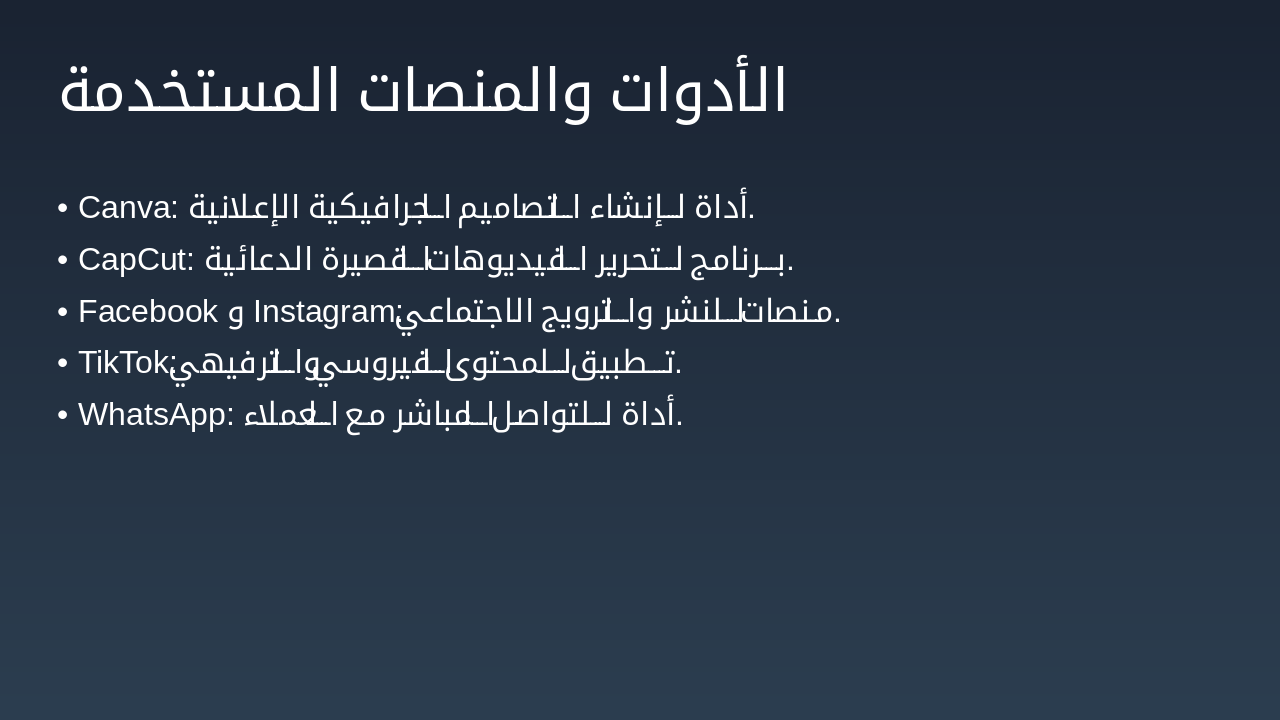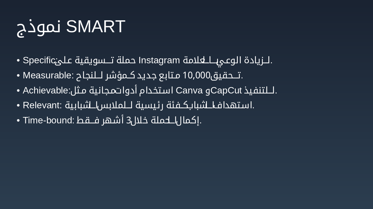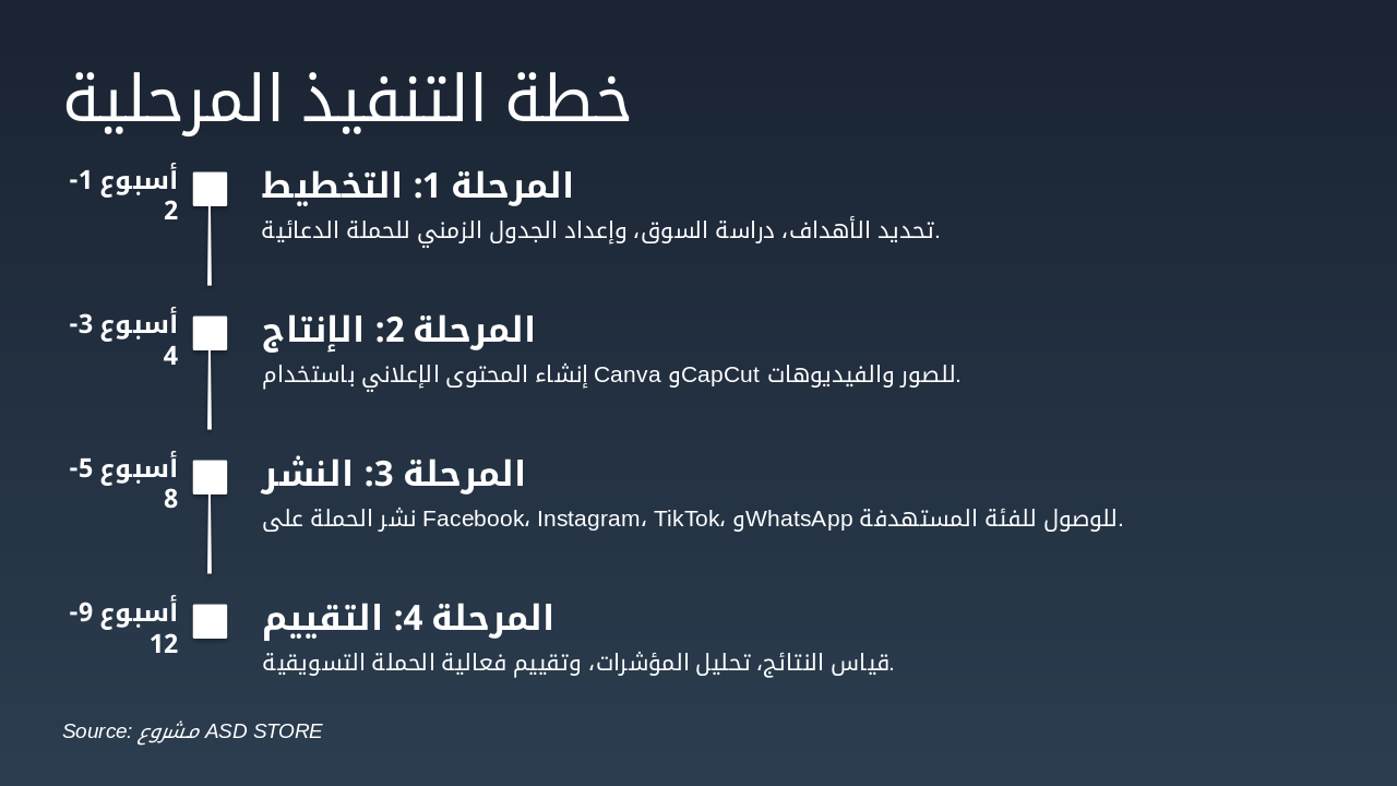 أسبوع 1-2: المرحلة 1: التخطيط تحديد الأهداف، دراسة السوق، وإعداد الجدول الزمني للحملة الدعائية. أسبوع 3-4: المرحلة 2: الإنتاج إنشاء المحتوى الإعلاني باستخدام Canva وCapCut للصور والفيديوهات. أسبوع 5-8: المرحلة 3: النشر نشر الحملة على Facebook، Instagram، TikTok، وWhatsApp للوصول للفئة المستهدفة. أسبوع 9-12: المرحلة 4: التقييم قياس النتائج، تحليل المؤشرات، وتقييم فعالية الحملة التسويقية.