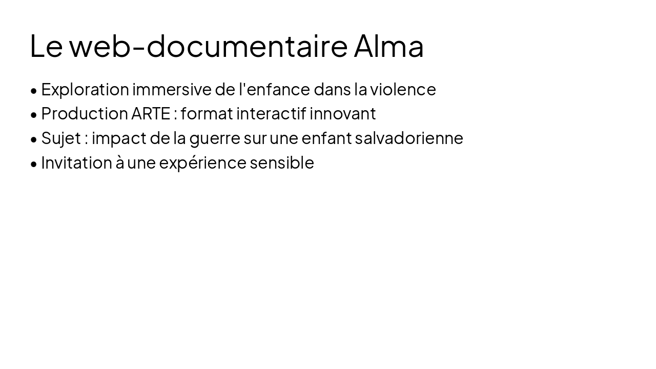 The slide presents a synthesis highlighting the profound humanist scope and exemplary sensitivity of the web-doc as a powerful tool to raise awareness about violence suffered by children, with a lasting impact through interactivity. It closes with a powerful humanist plea and a CTA to explore Alma and raise awareness together.