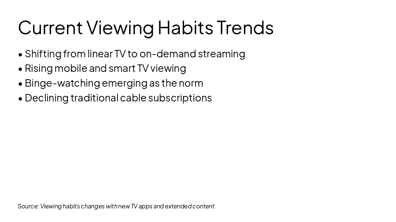 2015: Rise of Netflix/Hulu Streaming services like Netflix and Hulu gain massive popularity, shifting viewers from cable TV. 2018: Smart TV Dominance Smart TVs become the standard, integrating streaming apps and internet directly into living rooms. 2021: App Integrations Boom Seamless app integrations across devices boost convenience and multi-platform content access. 2023: AI Personalization Surge AI algorithms deliver hyper-personalized recommendations, enhancing user engagement and retention. 2025: VR/AR Viewing Projected Virtual and augmented reality transform viewing into immersive, interactive experiences.