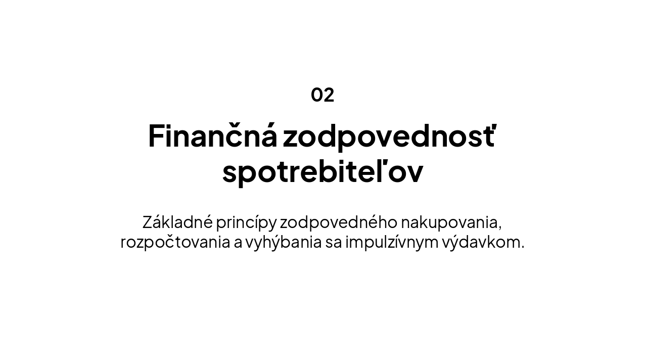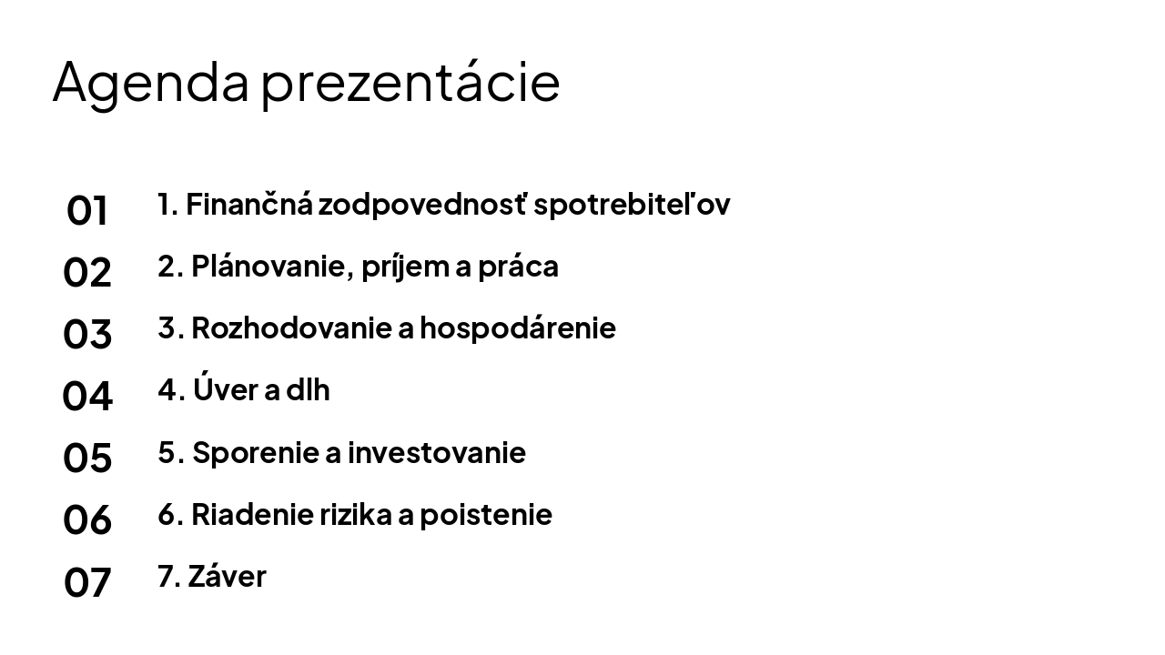 Prezentácia na tému Finančná gramotnosť s podtémami: Finančná zodpovednosť spotrebiteľov, Plánovanie, príjem a práca, Rozhodovanie a hospodárenie spotrebiteľov, Úver a dlh, Sporenie a investovanie, Riadenie rizika a poistenie.