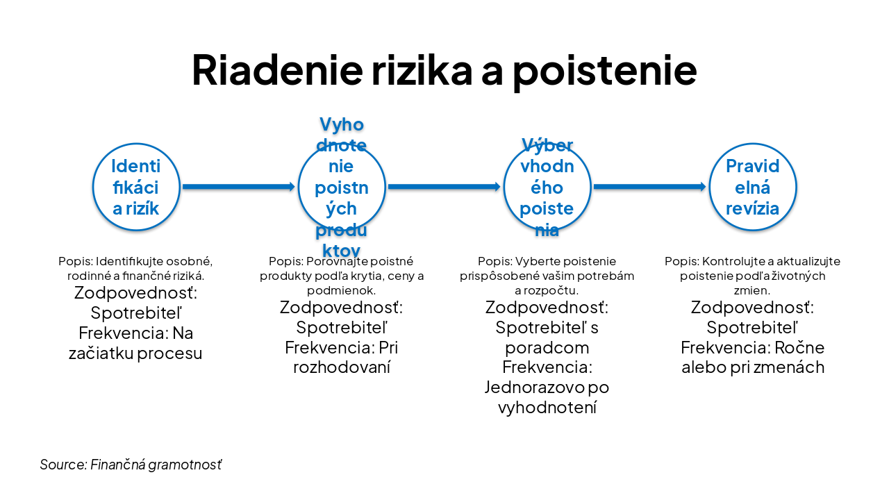 { "headers": [ "Etapa", "Popis", "Zodpovednosť", "Frekvencia" ], "rows": [ [ "Identifikácia rizík", "Identifikujte osobné, rodinné a finančné riziká.", "Spotrebiteľ", "Na začiatku procesu" ], [ "Vyhodnotenie poistných produktov", "Porovnajte poistné produkty podľa krytia, ceny a podmienok.", "Spotrebiteľ", "Pri rozhodovaní" ], [ "Výber vhodného poistenia", "Vyberte poistenie prispôsobené vašim potrebám a rozpočtu.", "Spotrebiteľ s poradcom", "Jednorazovo po vyhodnotení" ], [ "Pravidelná revízia", "Kontrolujte a aktualizujte poistenie podľa životných zmien.", "Spotrebiteľ", "Ročne alebo pri zmenách" ] ] }