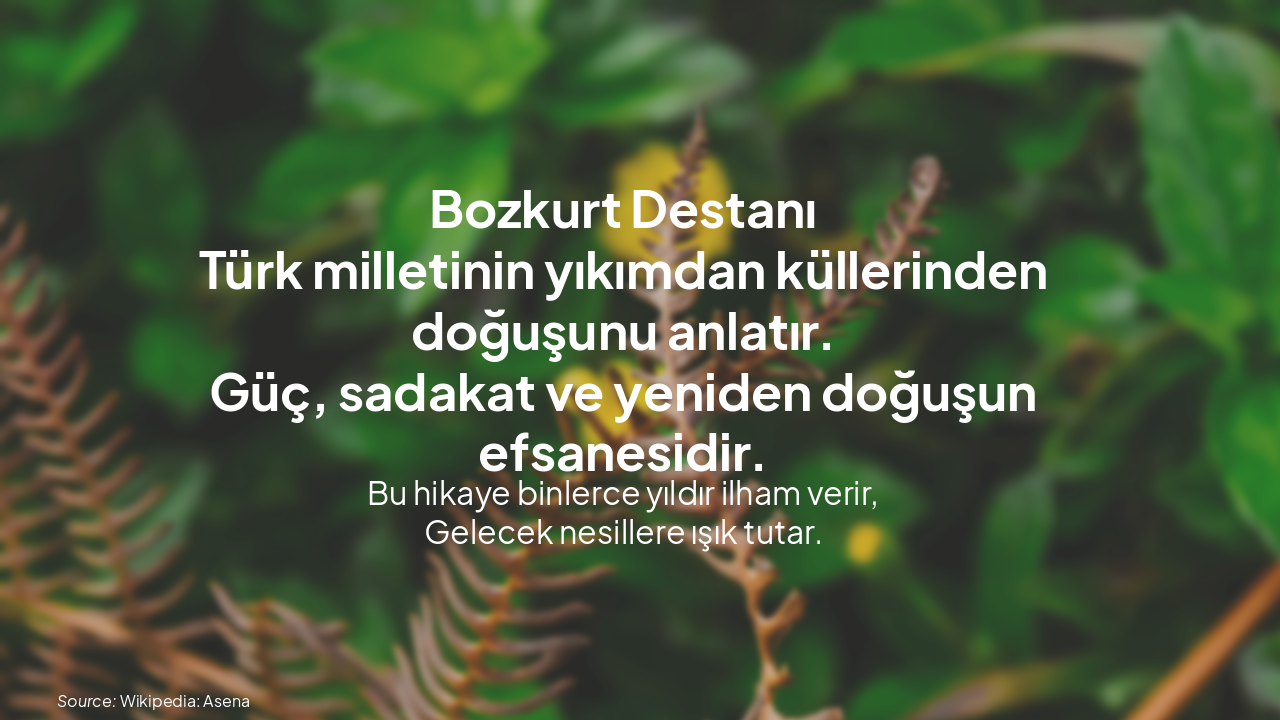 Türk mitolojisinin ikonik hikayesi Bozkurt Destanı'nı anlatan bu sunum, düşman saldırısından kurtulan çocuğun dişi kurt Asena tarafından korunması, mucizevi doğum ve Göktürklerin doğuşunu dramatik görsellerle aktarır. Yeniden doğuş ve Türk ruhunun s一