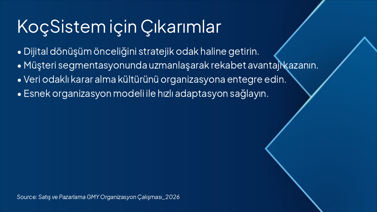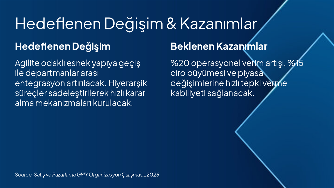 2024 Q4: Analiz ve Planlama Tamamlandı Mevcut durum analizi ve stratejik planlama çalışmaları finalize edildi. 2025: Pilot Uygulama Başlatıldı Yeni organizasyon yapısı seçili birimlerde pilot olarak test edildi. 2026 Q1-Q2: Tam Geçiş Gerçekleştirildi Tüm satış ve pazarlama GMY birimleri yeni yapıya tam geçiş yaptı. 2026 Q3-Q4: Performans Ölçüm ve Optimizasyon Kazanımlar ölçüldü, iyileştirmeler uygulandı ve raporlandı.